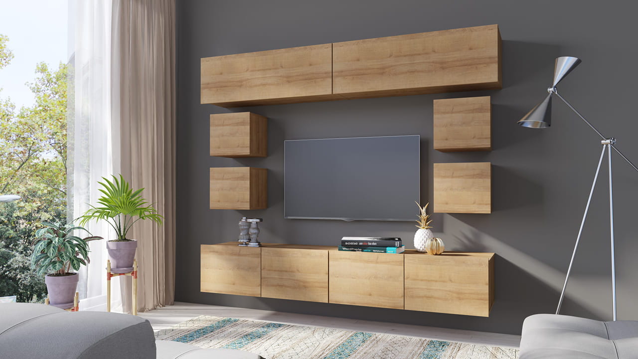 Meblościanka składa się z dwóch szafek RTV o szerokości 100cm, dwóch szafek wiszących poziomych oraz czterech kwadratów.