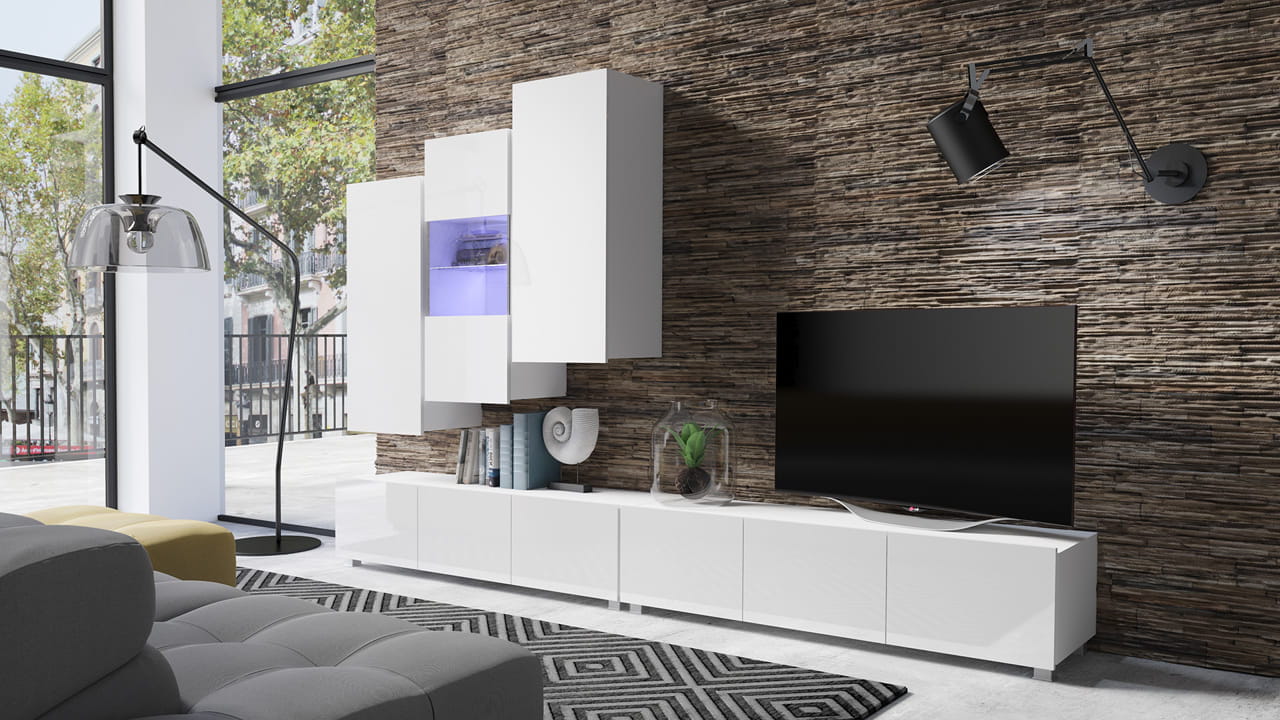 Meblościanka składa się z dwóch szafek RTV o szerokości 150cm, dwóch szafek wiszących pionowych oraz wiszącej witryny.