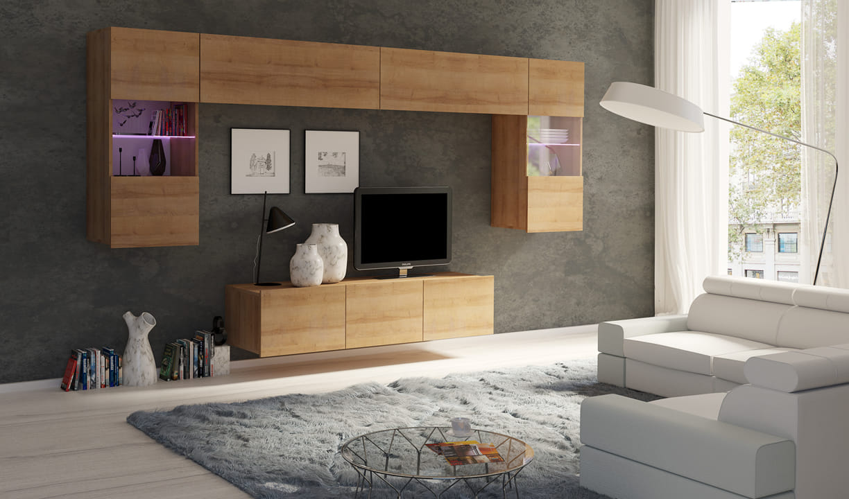 Meblościanka składa się z szafki RTV o szerokości 150cm, dwóch szafek poziomych oraz dwóch witryn wiszących.