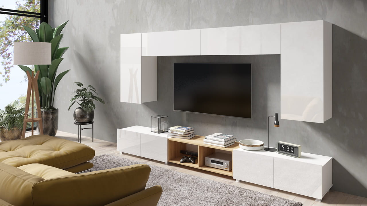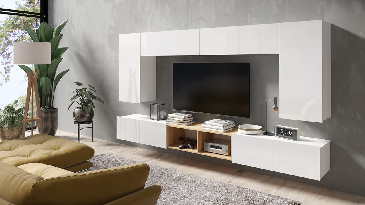 Meblościanka składa się z dwóch szafek RTV o szerokości 100cm, dwóch szafek poziomych, dwóch szafek wiszących pionowych oraz półki.