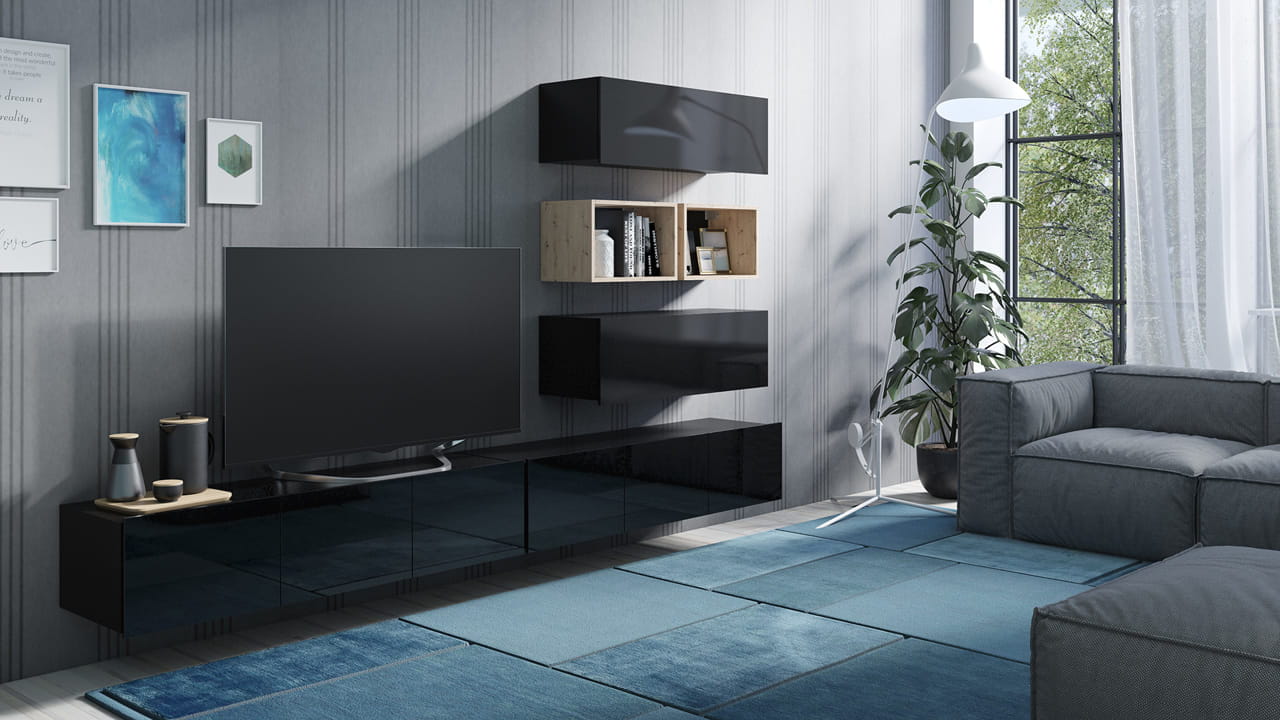 Meblościanka składa się z dwóch szafek RTV o szerokości 150cm, dwóch szafek wiszących oraz dwóch półek o szerokości 50cm.