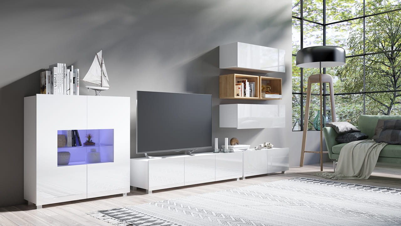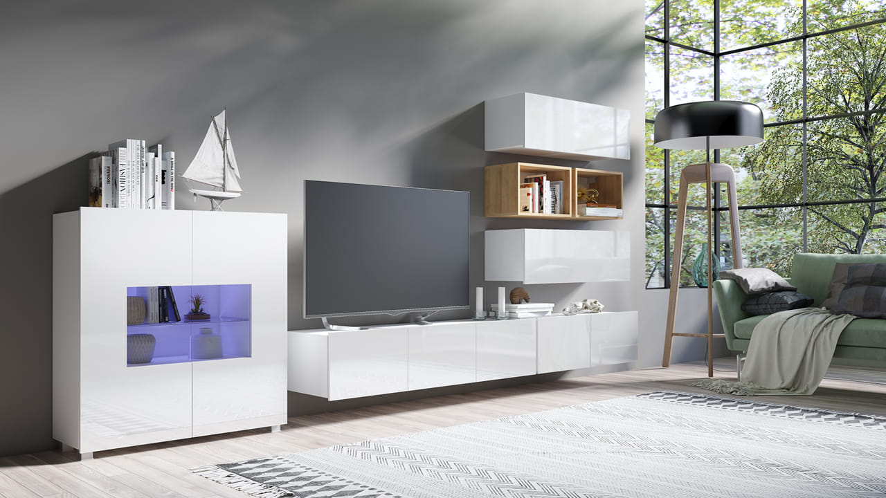 Meblościanka składa się z dwóch szafek RTV - jedna o szerokości 150cm oraz druga o szerokości 100cm, dwóch szafek wiszących, dwóch półek o szerokości 50cm oraz komody o szerokości 100cm.