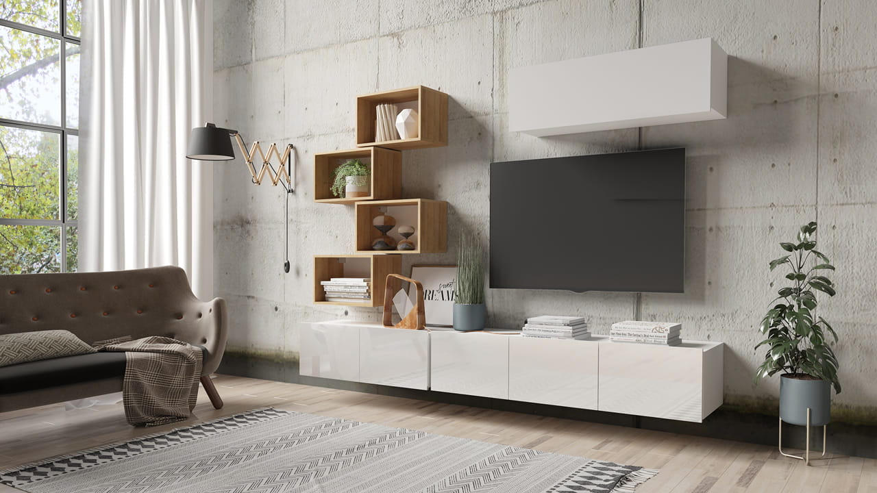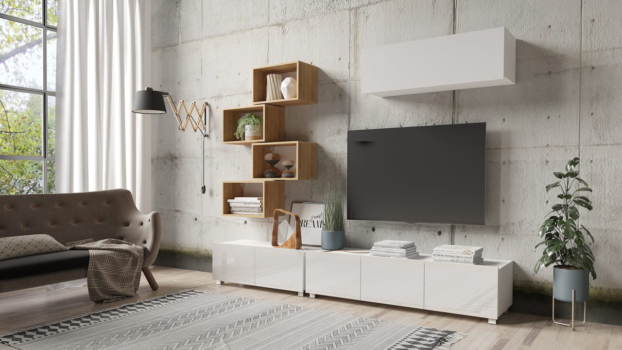 Meblościanka składa się z dwóch szafek RTV - jedna o szerokości 150cm oraz druga o szerokości 100cm, jednej szafki wiszącej oraz czterech półek o szerokości 50cm.