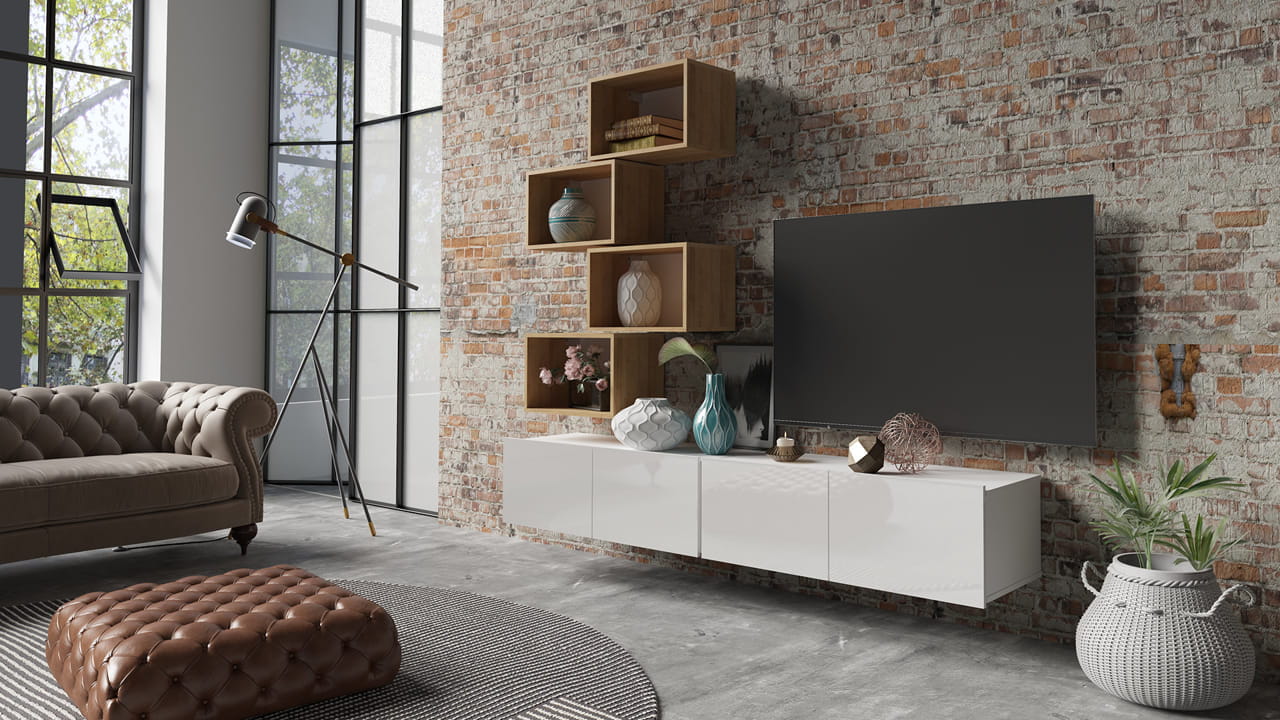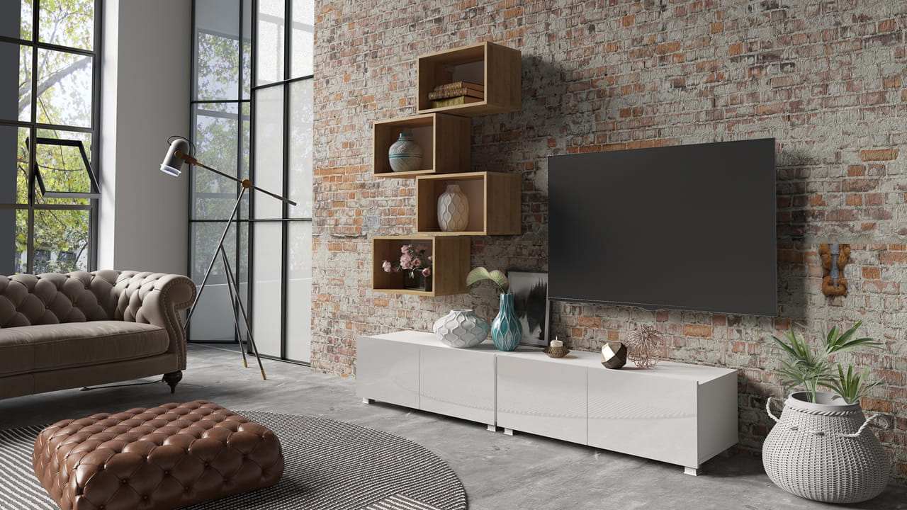 Meblościanka składa się z dwóch szafek RTV o szerokości 100cm oraz czterech półek o szerokości 50cm.
