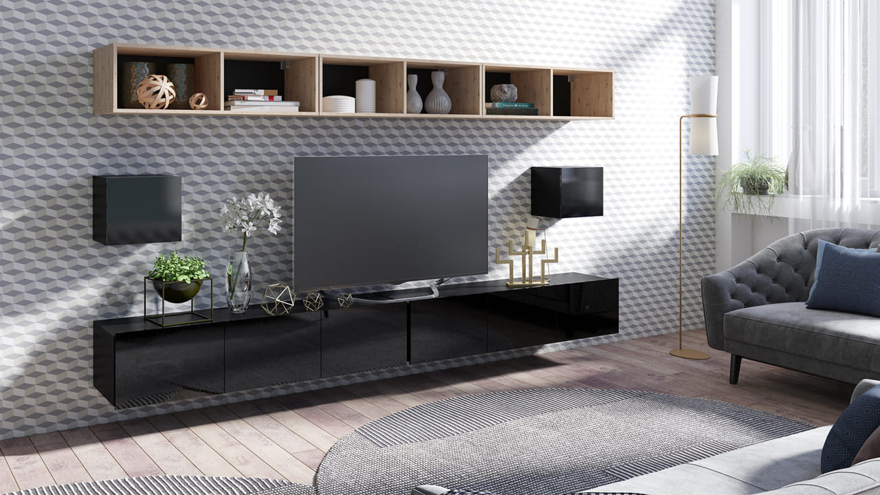 Meblościanka składa się z dwóch szafek RTV o szerokości 150cm, dwóch kwadratów oraz sześciu półek o szerokości 50cm.