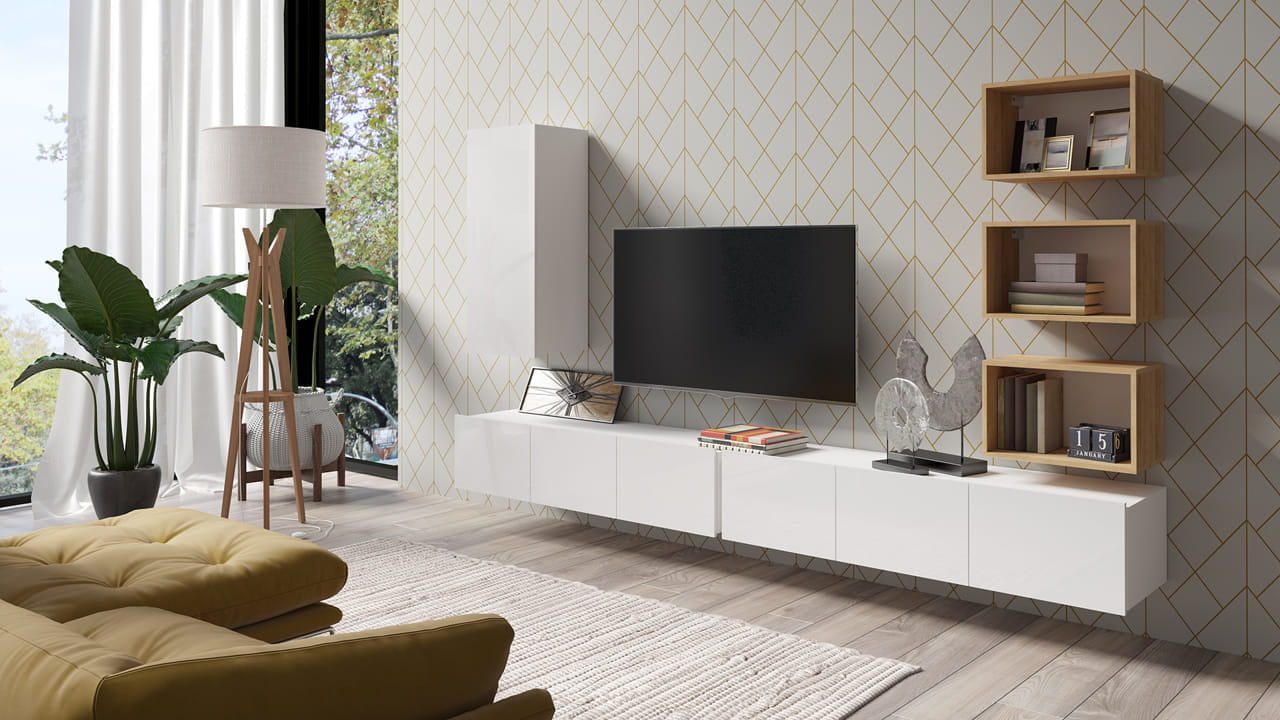 Meblościanka składa się z dwóch szafek RTV o szerokości 150cm, jednej szafki wiszącej pionowej oraz trzech półek o szerokości 50cm.