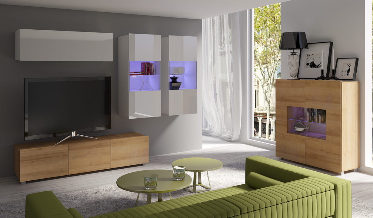 Meblościanka składa się z szafki RTV o szerokości 150cm, dwóch witryn wiszących, szafki wiszącej poziomej oraz komody