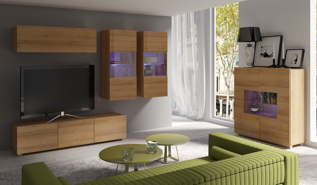 Meblościanka składa się z szafki RTV o szerokości 150cm, dwóch witryn wiszących, szafki wiszącej poziomej oraz komody
