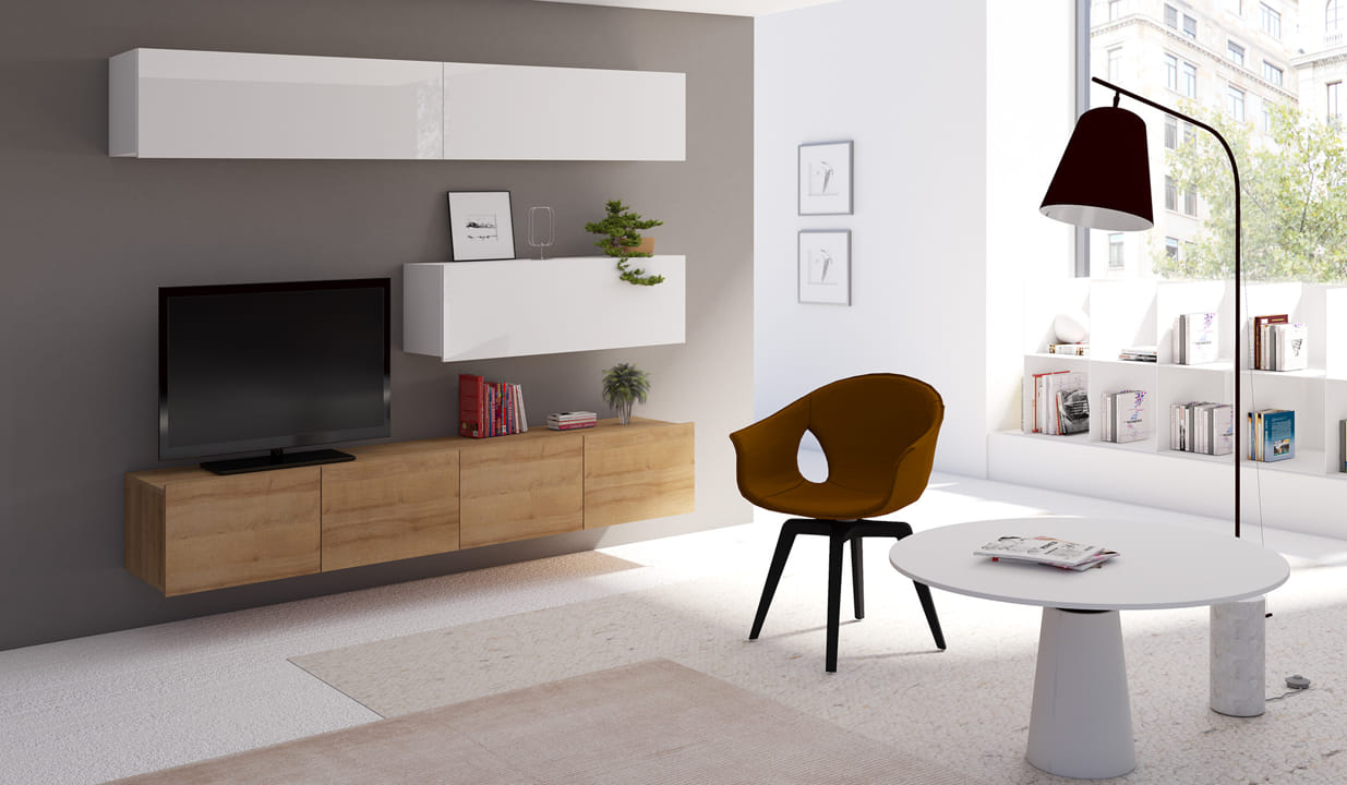 Meblościanka składa się z szafki RTV o szerokości 100cm oraz trzech szafek wiszących.