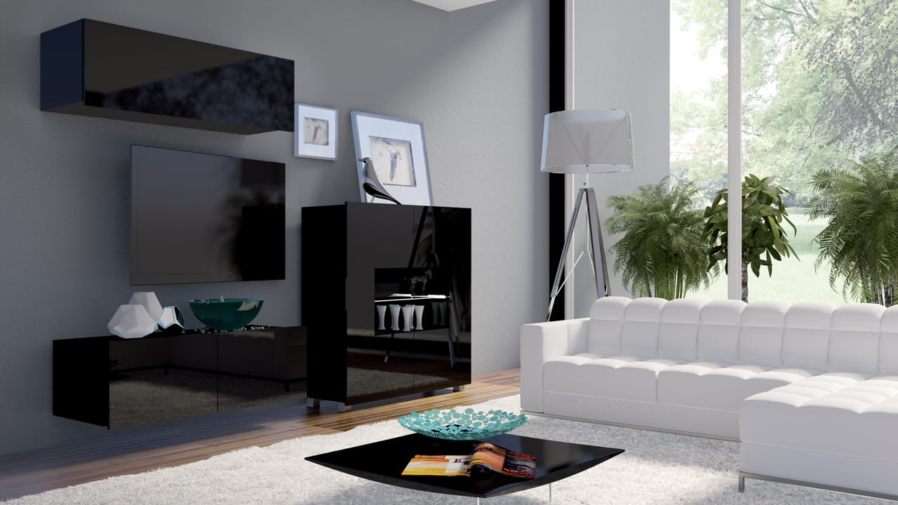 Meblościanka składa się z szafki RTV o szerokości 100cm, szafki wiszącej oraz komody.