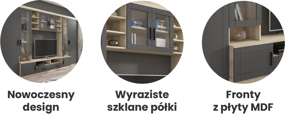 Wszystkie elementy meblościanki Paris wykonane są z wysokiej jakości materiałów. Korpus składa się z płyty laminowanej, a fronty z płyty MDF o grubości 16mm. Obrzeża zostały zabezpieczone melaminą. Kolorystyka w barwie dąb sonoma oraz grafit o rustykalnym wykończeniu zapewnia naturalną atmosferę i wygodę. Oprócz niesamowitego designu meblościanka Paris wyróżnia się wszechstronną przestrzenią do przechowywania wewnątrz poszczególnych elementów.