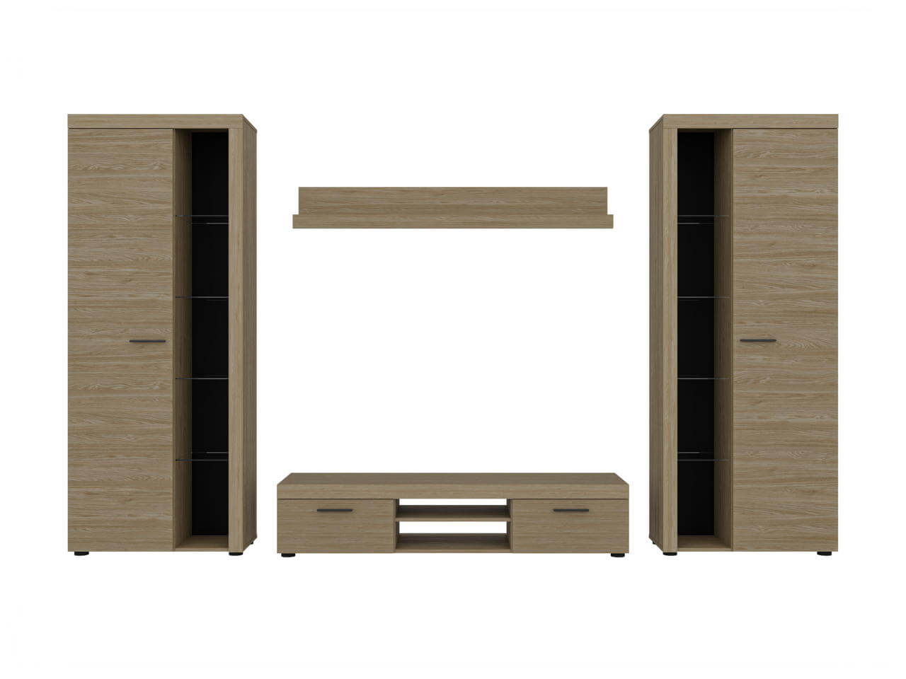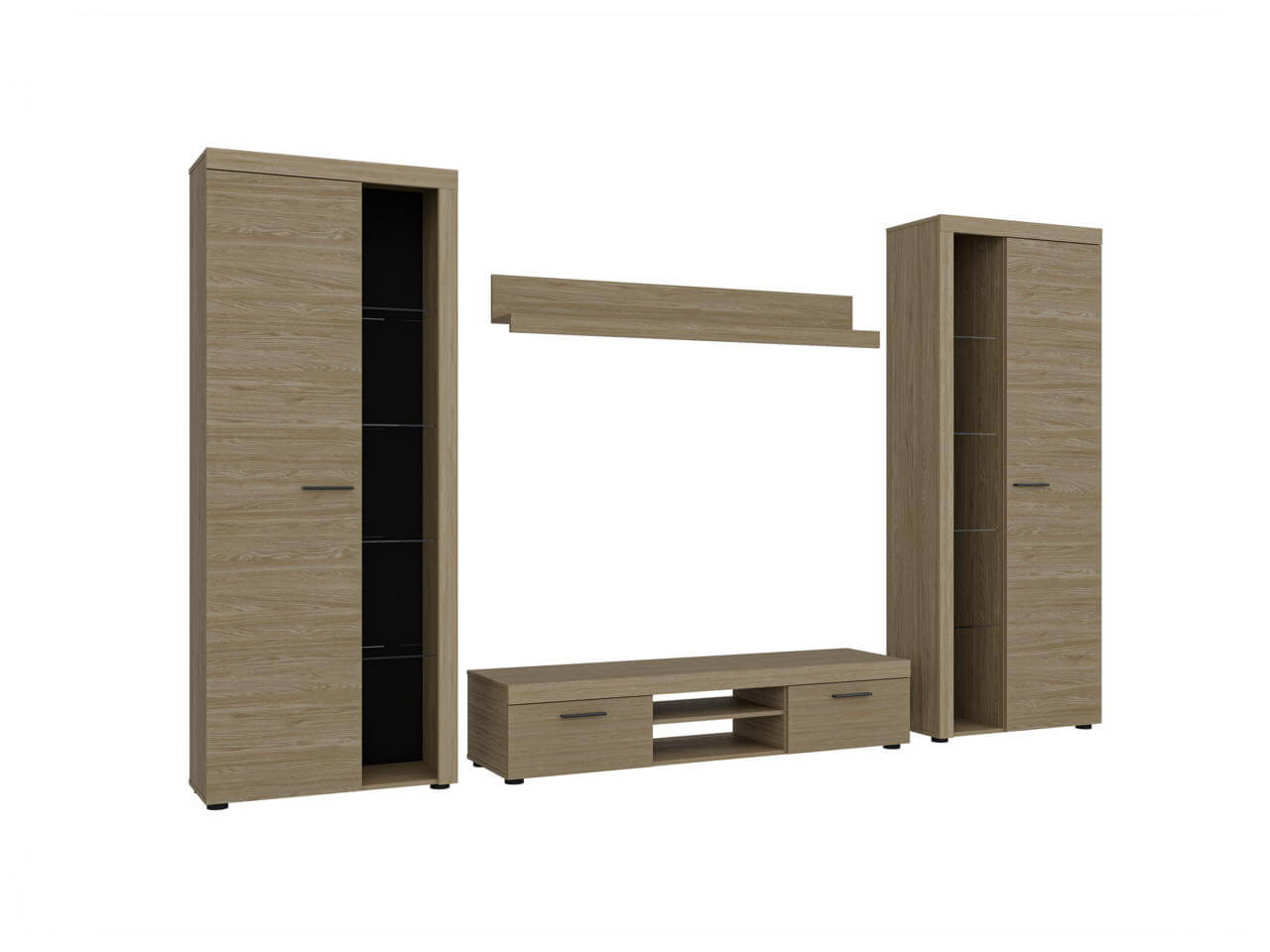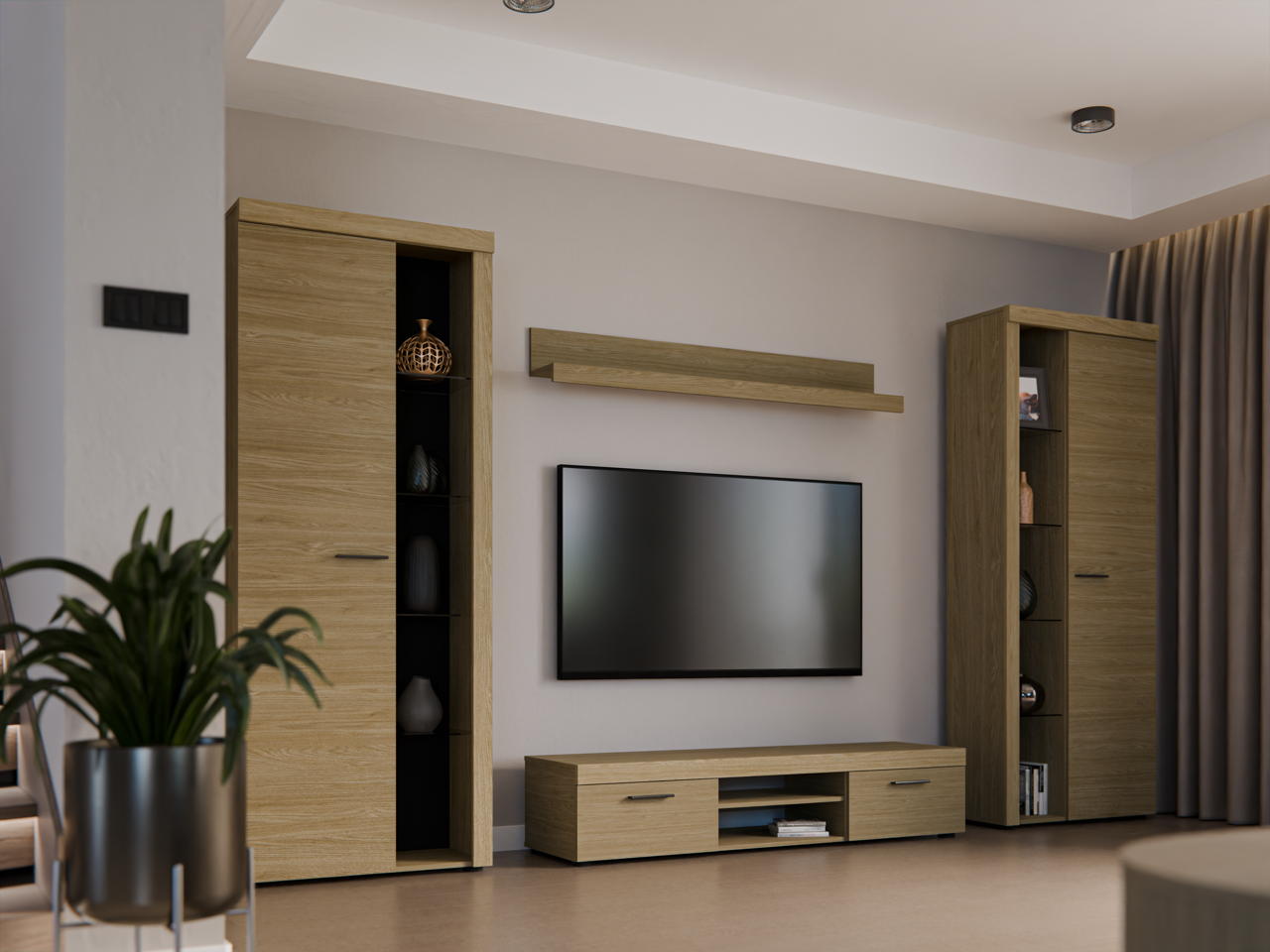 Kompozycja Rumba XL jest ponadczasowa i została zaprojektowana w 4 wersjach kolorystycznych: dąb sonoma, biały, dąb lefkas, beton jasny + biały. W skład meblościanki Rumba XL wchodzą 2 wysokie witryny stojące, stolik RTV oraz półka wisząca. Całość tworzy doskonały zestaw dla wszystkich łaknących ogromnej ilości miejsca do przechowywania. Kompozycja została wykonana z wysokiej jakości płyty laminowanej 15mm odpornej na zanieczyszczenia. Meblościanka posiada szklane półki, które opcjonalnie możesz podświetlić oświetleniem LED, stwarzając tym samym reprezentacyjne miejsce na pamiątki z wakacji, ulubione dekoracje lub kosztowności. Wszechstronny stolik RTV pozwala na umieszczenie telewizora w centralnym punkcie salonu, a wygodne półki dają możliwość łatwego podłączenia sprzętu multimedialnego bez widocznych kabli. Meblościanka Rumba XL to geometryczna harmonia i idealna kompozycja dla wielbicieli eleganckiego minimalizmu.