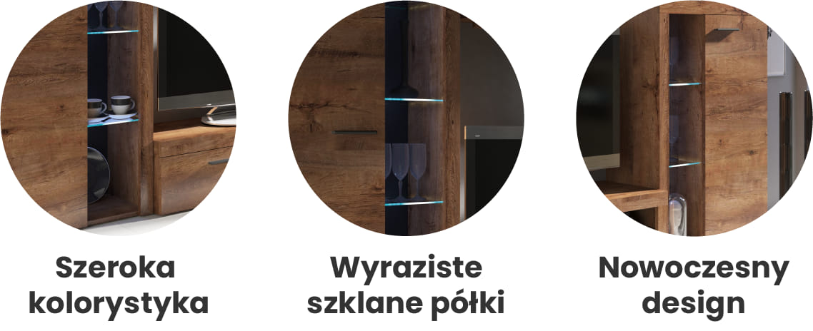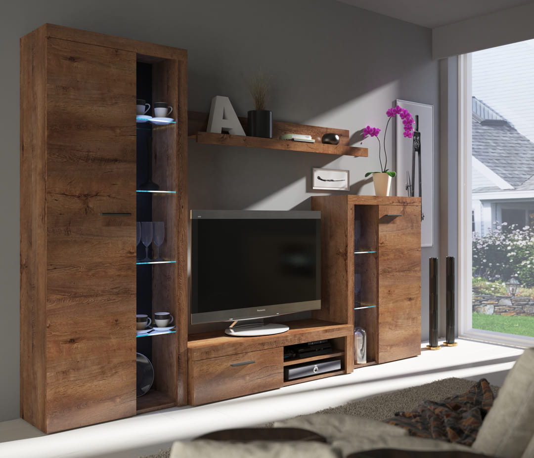 Meblościanka Rumba od Mebelzone wzbogaci każdą przestrzeń życiową. Kompozycja jest ponadczasowa i została zaprojektowana w 5 wersjach kolorystycznych: dąb sonoma, biały, dąb lefkas, beton jasny + biały, old style + matera. Korpus mebli, półka ścienna i wszystkie elementy na frontach wyróżniają się naturalnym wyglądem. Meblościanka Rumba oferuje mnóstwo miejsca do przechowywania wszystkich rzeczy, które musisz pomieścić. Ponadto możesz postawić telewizor na stoliku RTV, a książki z łatwością pomieścisz na półce wiszącej. Kompozycja została wykonana z wysokiej jakości płyty laminowanej 15mm odpornej na zanieczyszczenia. Meblościanka posiada szklane półki, które opcjonalnie możesz podświetlić oświetleniem LED, stwarzając tym samym reprezentacyjne miejsce na pamiątki z wakacji, ulubione dekoracje lub kosztowności. W skład kolekcji Rumba wchodzi również Meblościanka Rumba XL, która oferuje jeszcze więcej miejsca na Twoje ulubione przedmioty. Podaruj sobie mnóstwo radości z meblami z serii Rumba i odkryj piękno swojego salonu z Mebelzone.