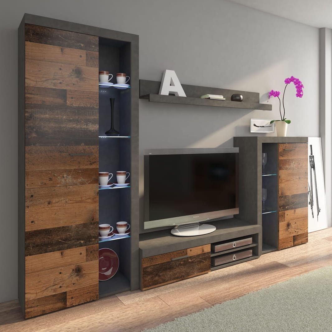 Meblościanka Rumba od Mebelzone wzbogaci każdą przestrzeń życiową. Kompozycja jest ponadczasowa i została zaprojektowana w 5 wersjach kolorystycznych: dąb sonoma, biały, dąb lefkas, beton jasny + biały, old style + matera. Korpus mebli, półka ścienna i wszystkie elementy na frontach wyróżniają się naturalnym wyglądem. Meblościanka Rumba oferuje mnóstwo miejsca do przechowywania wszystkich rzeczy, które musisz pomieścić. Ponadto możesz postawić telewizor na stoliku RTV, a książki z łatwością pomieścisz na półce wiszącej. Kompozycja została wykonana z wysokiej jakości płyty laminowanej 15mm odpornej na zanieczyszczenia. Meblościanka posiada szklane półki, które opcjonalnie możesz podświetlić oświetleniem LED, stwarzając tym samym reprezentacyjne miejsce na pamiątki z wakacji, ulubione dekoracje lub kosztowności. Podaruj sobie mnóstwo radości z meblami z serii Rumba i odkryj piękno swojego salonu z Mebelzone.