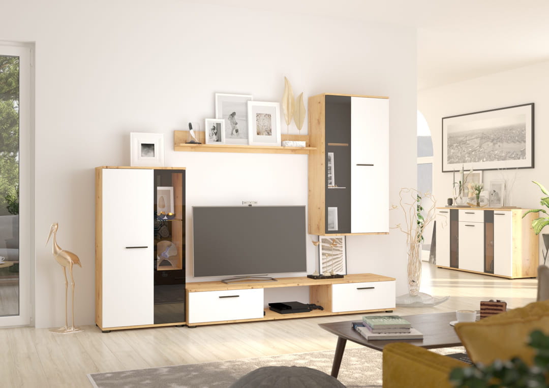 • Wysokiej jakości wykończenie melaminowe, matowa biała struktura, białe fronty, dzięki którym Twój salon zyska jednocześnie jasność i kontrast idealny do każdego stylu życia.