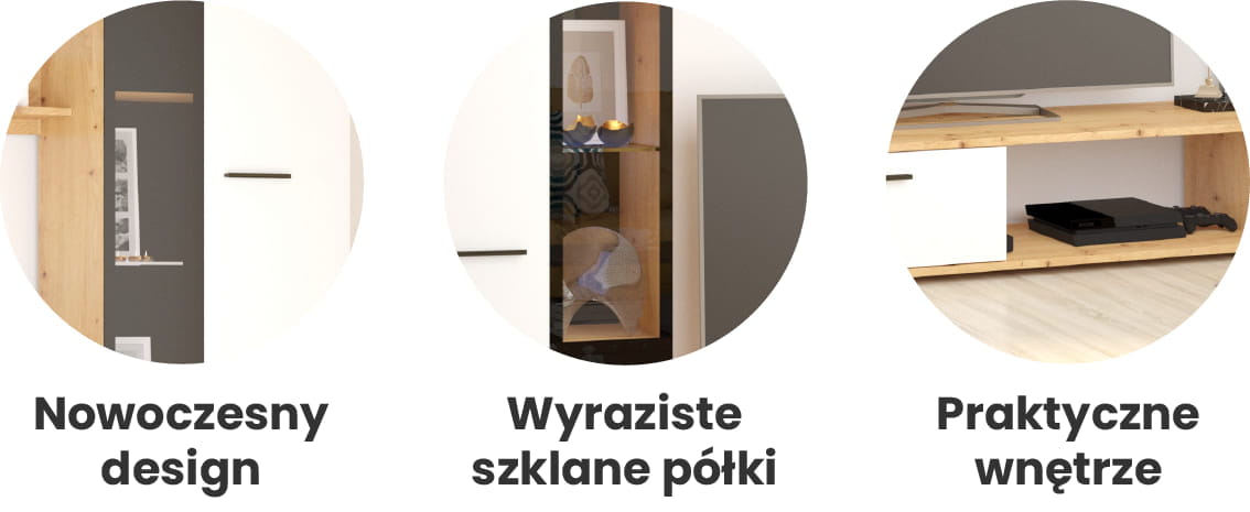 • Wszystkie drzwi posiadają dyskretne i eleganckie uchwyty. A dzięki mnogości przegródek możesz przechowywać i umieścić wszystkie swoje urządzenia elektroniczne, takie jak odtwarzacz DVD, telewizor, system HI-FI w wygodnym i łatwo dostępnym miejscu.