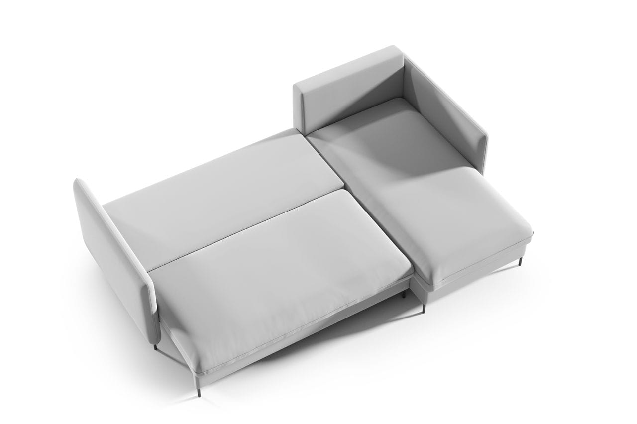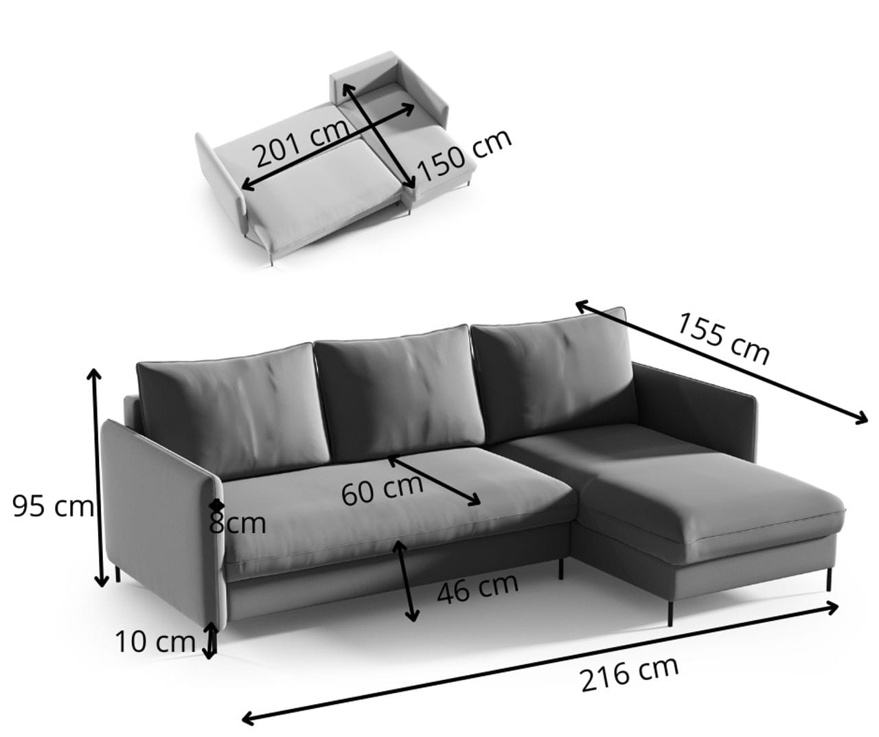 Narożnik Bella to wyjątkowy mebel wykonany w stylu skandynawskim. Konstrukcja mebla wykonana jest z drewna oraz płyty wiórowej co gwarantuje użytkowanie przez długie lata. Na siedzisku zastosowano wysokiej jakości piankę poliuretanową T30 oraz sprężyny faliste, które podnoszą komfort użytkowania. Prezentowany narożnik wyposażony został w funkcję spania oraz pojemnik na pościel. Zastosowany automat typu DL ułatwia rozkładanie sofy, dzięki któremu uzyskasz większą powierzchnię spania i swobodny dostęp do pojemnika na pościel. Zastosowanie wysokich nóżek w kolorze czarnym podkreśla loftowy charakter mebla.