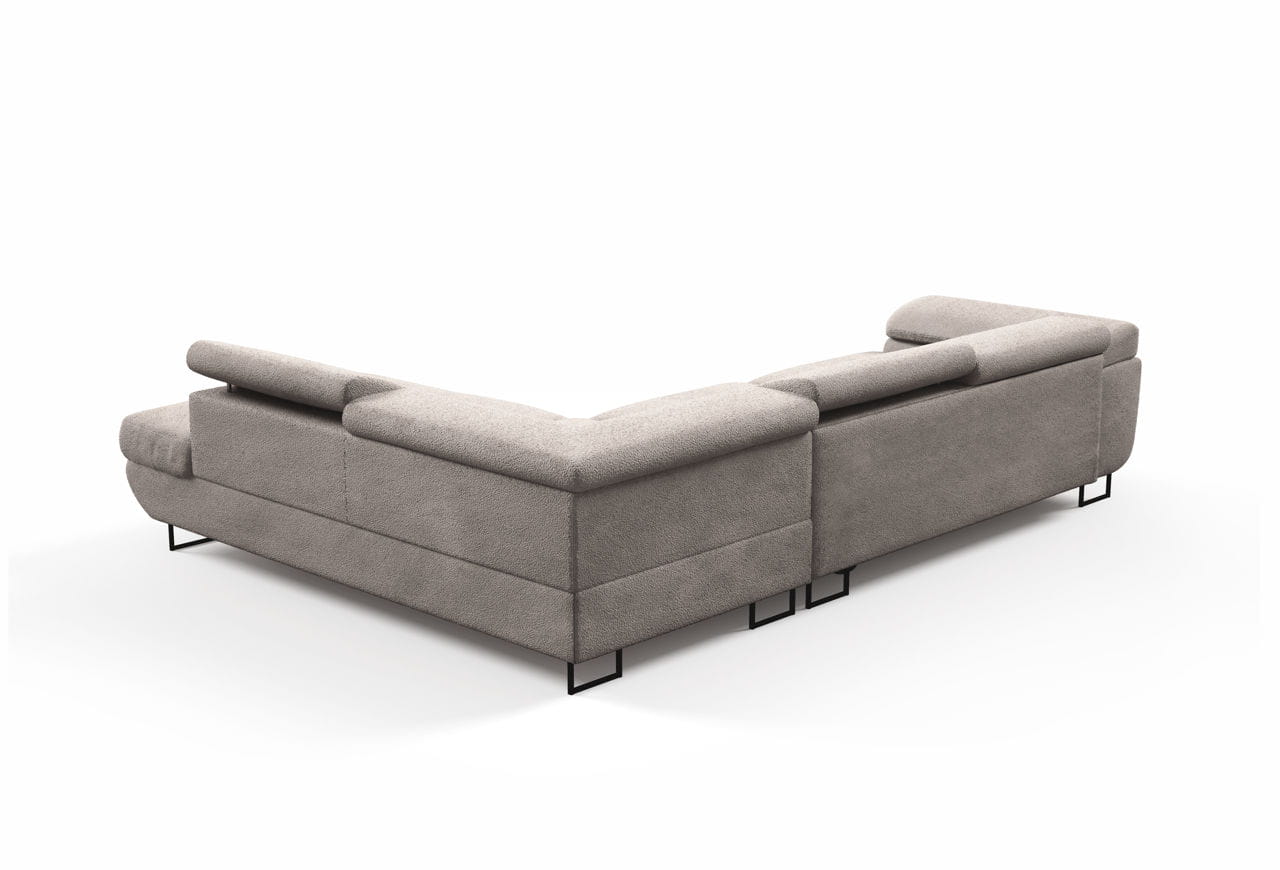 Narożnik Ontario posiada regulowane zagłówki, które pozwalają na dopasowanie oparcia do indywidualnych potrzeb użytkownika, zapewniając maksymalny komfort podczas odpoczynku. Czarne, metalowe nóżki dodają mu lekkości i elegancji, a zarazem podkreślają jego nowoczesny charakter. Głębokie siedziska i szerokie podłokietniki gwarantują relaks na najwyższym poziomie.