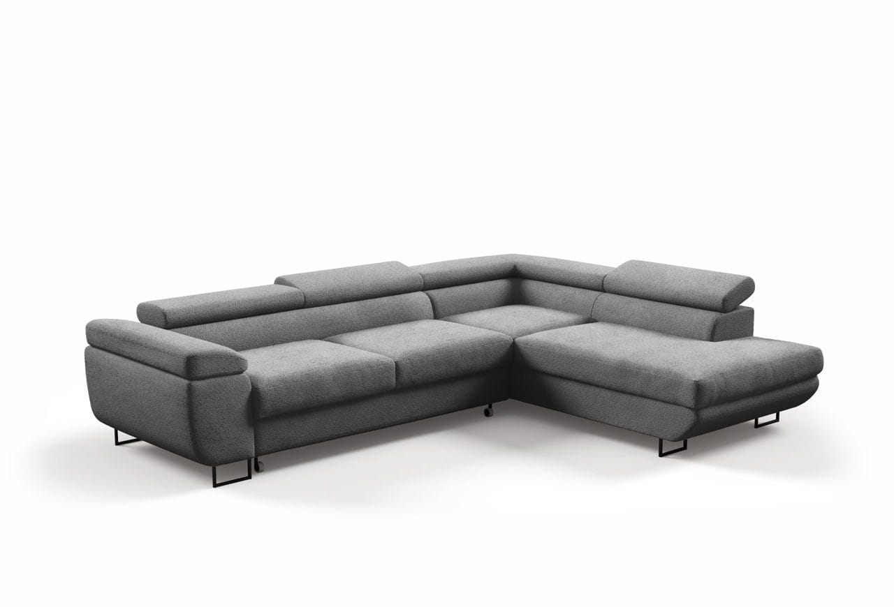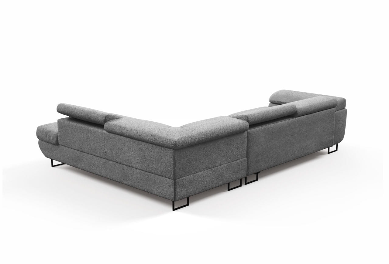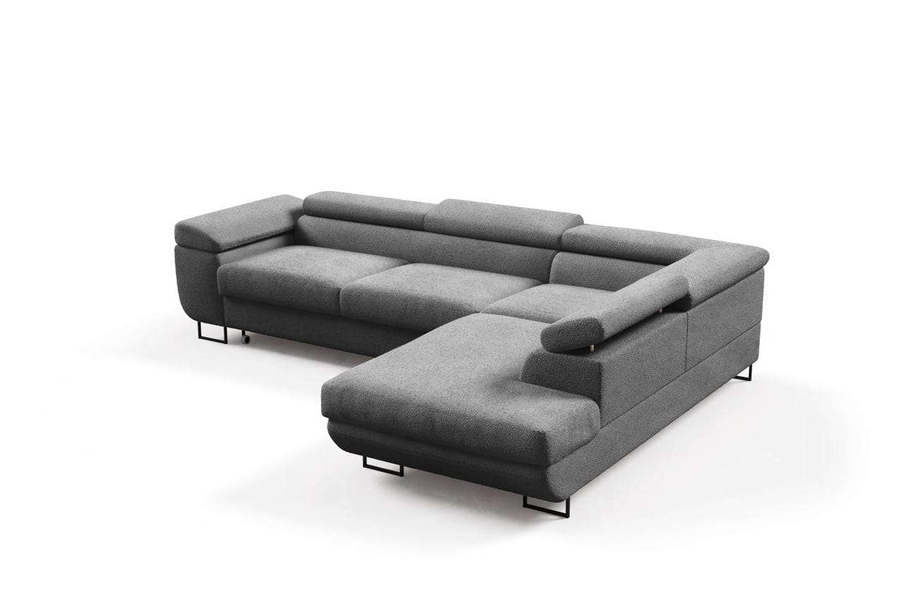 Narożnik Ontario posiada regulowane zagłówki, które pozwalają na dopasowanie oparcia do indywidualnych potrzeb użytkownika, zapewniając maksymalny komfort podczas odpoczynku. Czarne, metalowe nóżki dodają mu lekkości i elegancji, a zarazem podkreślają jego nowoczesny charakter. Głębokie siedziska i szerokie podłokietniki gwarantują relaks na najwyższym poziomie.
