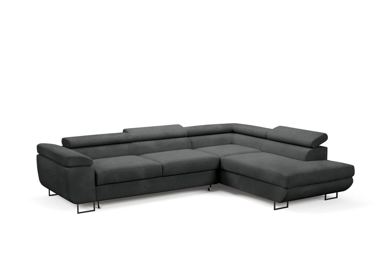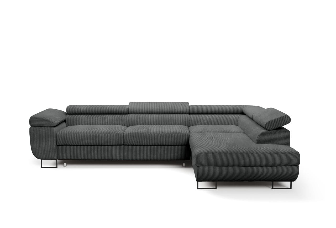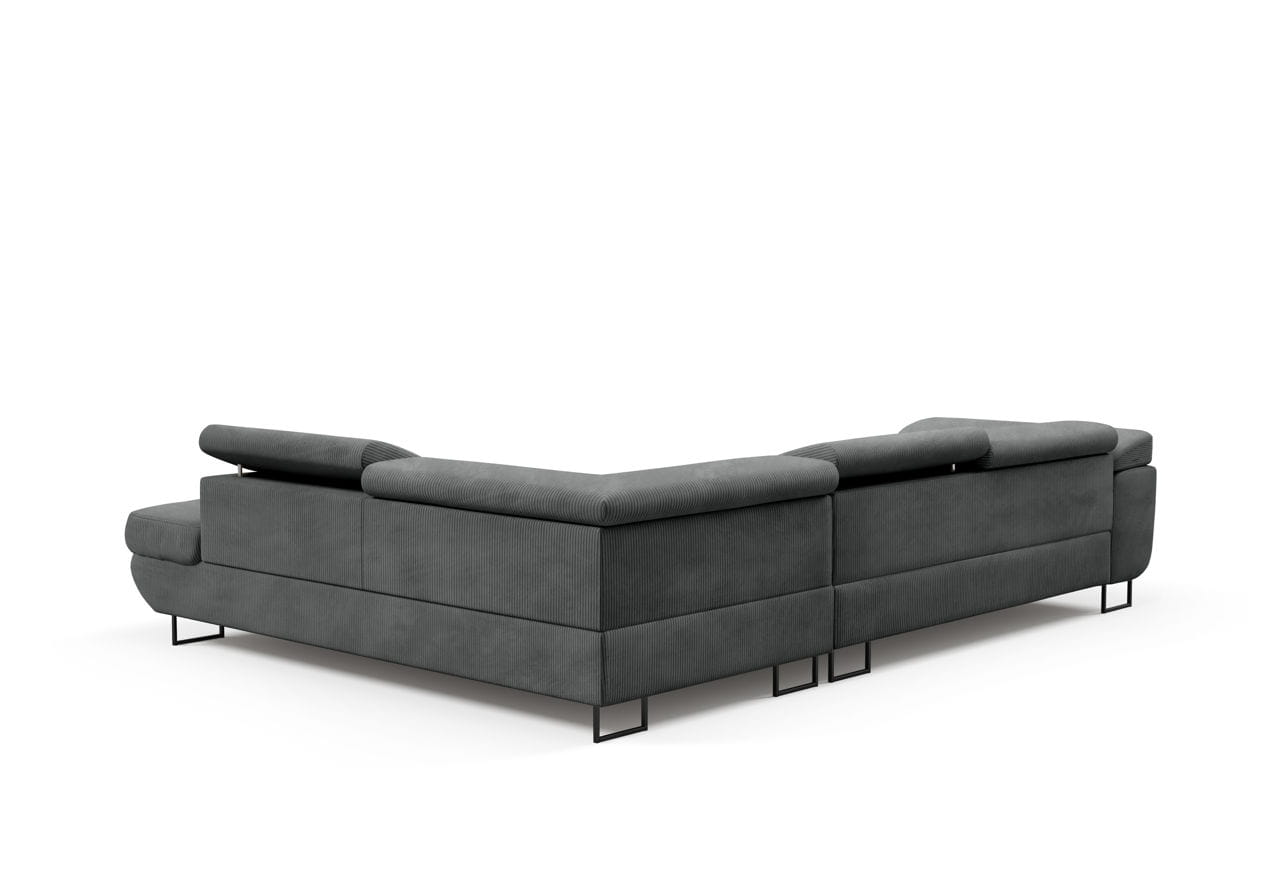 Narożnik Ontario posiada regulowane zagłówki, które pozwalają na dopasowanie oparcia do indywidualnych potrzeb użytkownika, zapewniając maksymalny komfort podczas odpoczynku. Czarne, metalowe nóżki dodają mu lekkości i elegancji, a zarazem podkreślają jego nowoczesny charakter. Głębokie siedziska i szerokie podłokietniki gwarantują relaks na najwyższym poziomie.