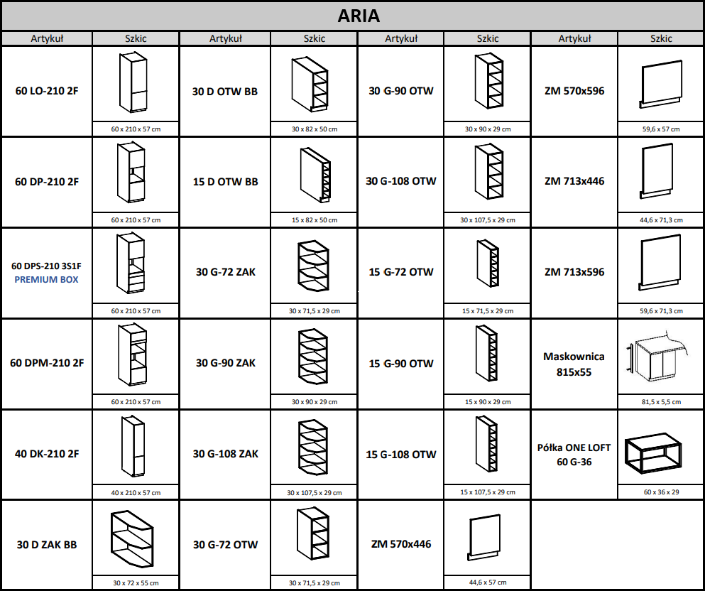 Wszystkie dostępne szafki kuchni Aria: