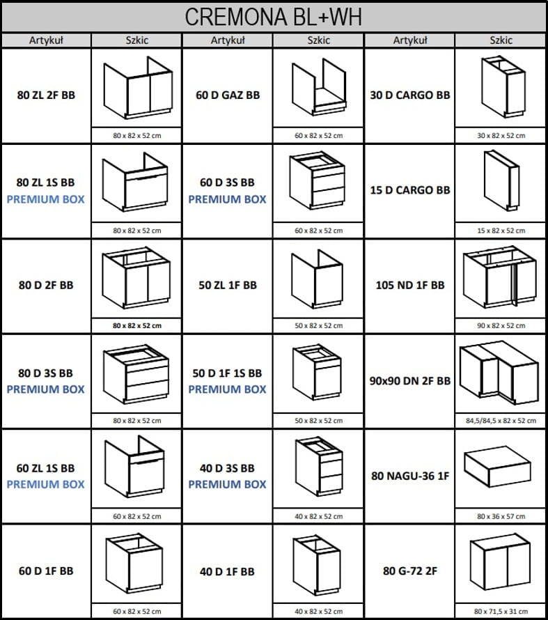 Wszystkie dostępne szafki kuchni Cremona biały: