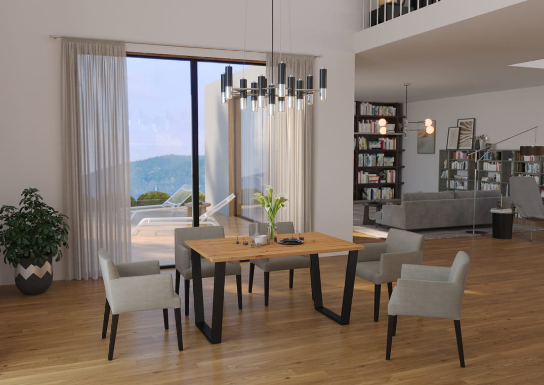 Stół industrialny Cezar to propozycja dla przestrzeni o charakterze loftowym. Nogi stołu wykonane zostały z profilu, malowane proszkowo na kolor czarny mat. Blat stołu to płyta laminowana o grubości 28mm.
