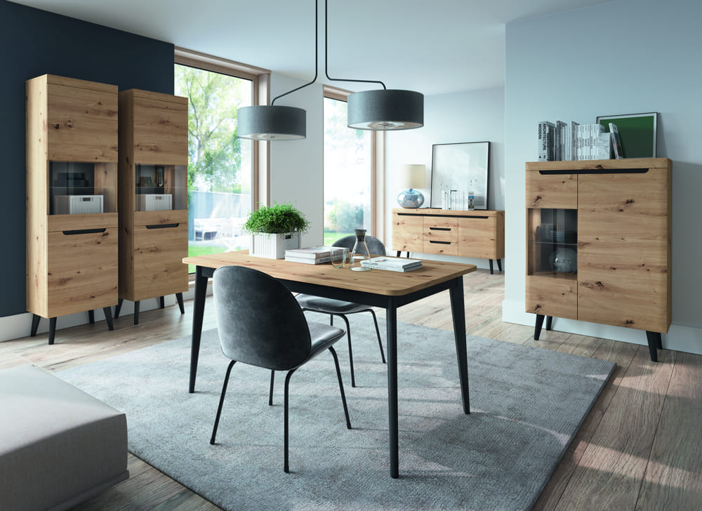 Nordi to niecodzienne połączenie ciekawego koloru dąb artisan z wysoką nogą w kolorze czarnym. Mnogość elementów w kolekcji sprawi, że nigdy nie zabraknie pomysłu na ciekawe aranżacje. Subtelny charakter formy podkreślony przez zmiękczenia krawędzi, pozwoli nabrać Twojemu wnętrzu lekkości i świeżego spojrzenia. Pozwól się zaskoczyć, wybierając Nordi.