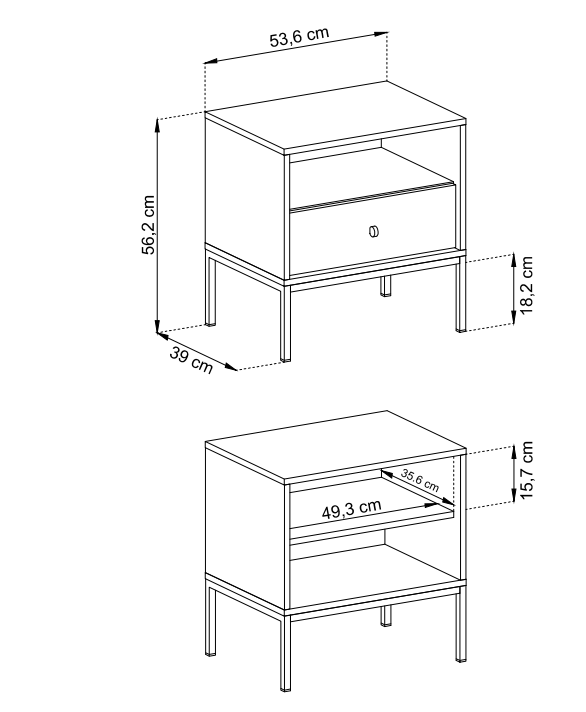 Stolik nocny Mono wyposażony został w szufladę oraz półkę.