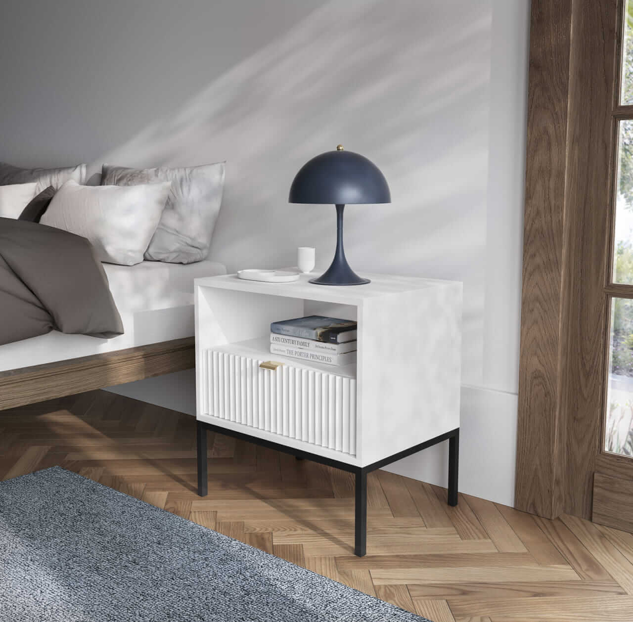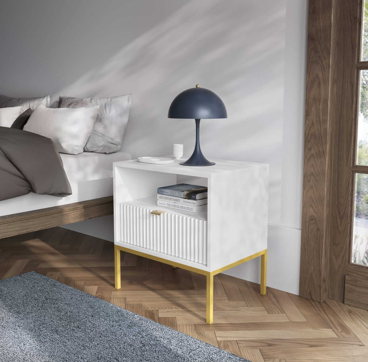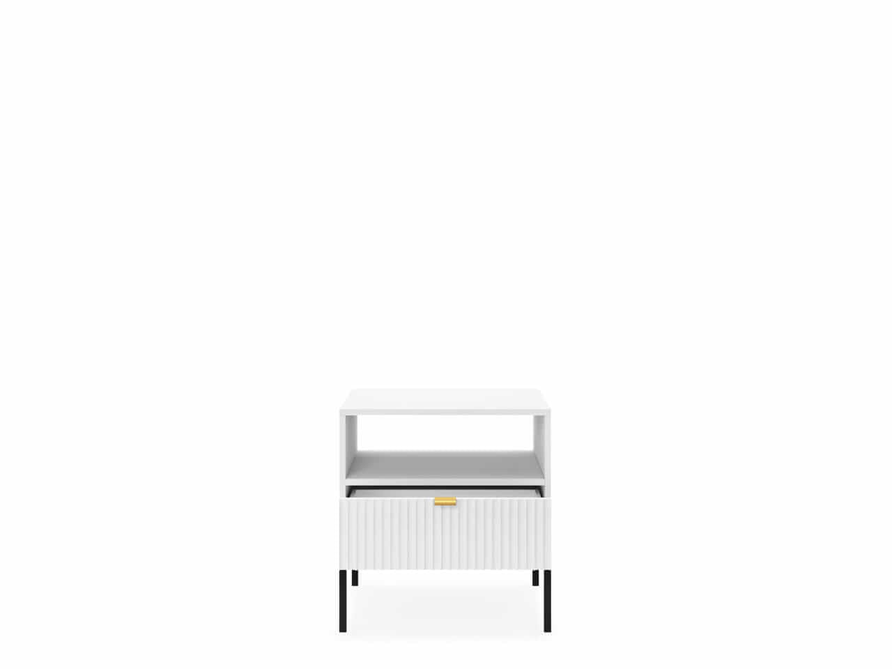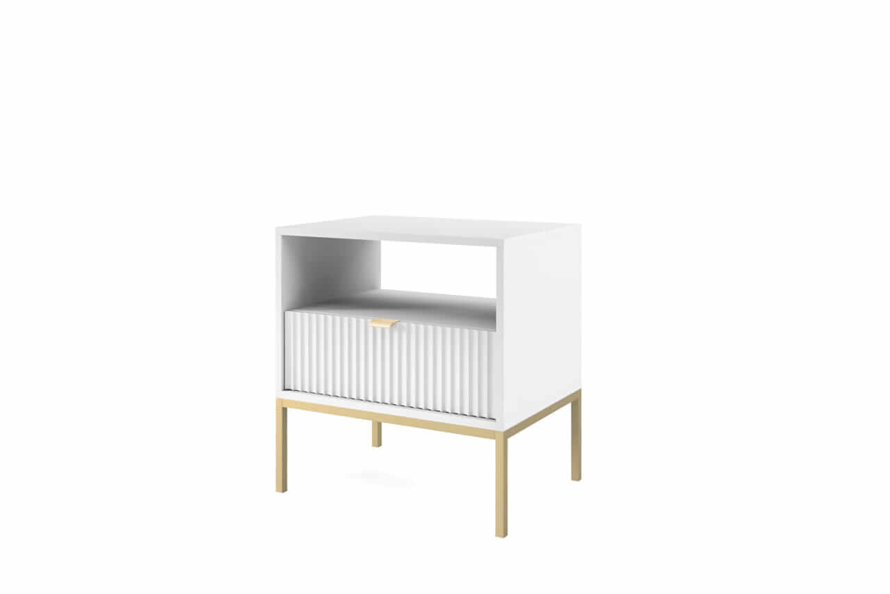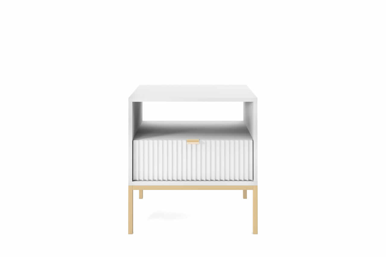 Kolekcja mebli Nova to nowoczesne połączenie funkcjonalności i minimalistycznego designu, idealne do stylowych wnętrz. Charakteryzuje się jasną kolorystyką z dominującą bielą, subtelnymi złotymi uchwytami oraz eleganckimi pionowymi żłobieniami na frontach. Smukłe, metalowe nóżki nadają meblom lekkości, a ich wysoka jakość wykonania zapewnia trwałość i wygodę użytkowania. Kolekcja obejmuje różnorodne elementy, takie jak komody, stoliki kawowe oraz szafki RTV, co pozwala na spójne urządzenie przestrzeni. Idealna dla osób ceniących prostotę, nowoczesność i harmonijne wnętrza.