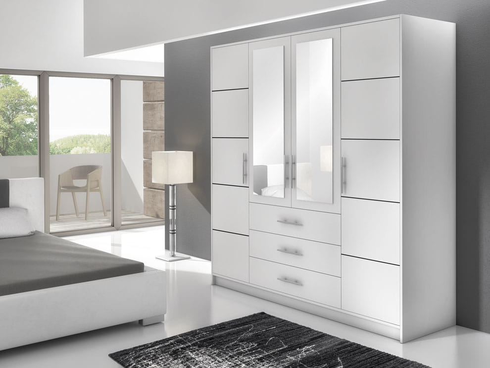 Nowoczesna czterodrzwiowa szafa Bali wykonana z ekologicznej płyty wiórowej wyłożonej wysokiej jakości melaminą. Zaprojektowana w przenikliwym białym odcieniu, który rozświetli Twoją przestrzeń. Zewnętrzne skrzydła szafy skrywają 5 pakownych półek z każdej strony idealnych do przechowywania bielizny, spodni lub drobnych akcesoriów. Centralna przestrzeń zapewnia dodatkowe miejsce na wieszaki, a dzięki 3 dodatkowym szufladom z łatwością pomieścisz i uporządkujesz wszystkie ubrania. Szafa Bali gwarantuje odpowiednią ilość miejsca do przechowywania dla najbardziej wymagających.