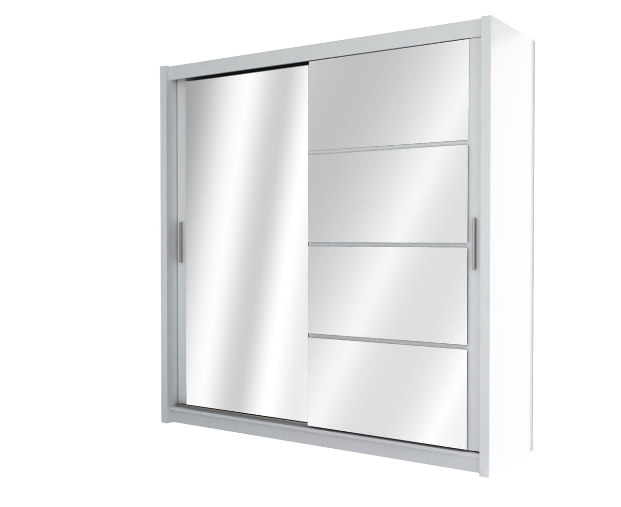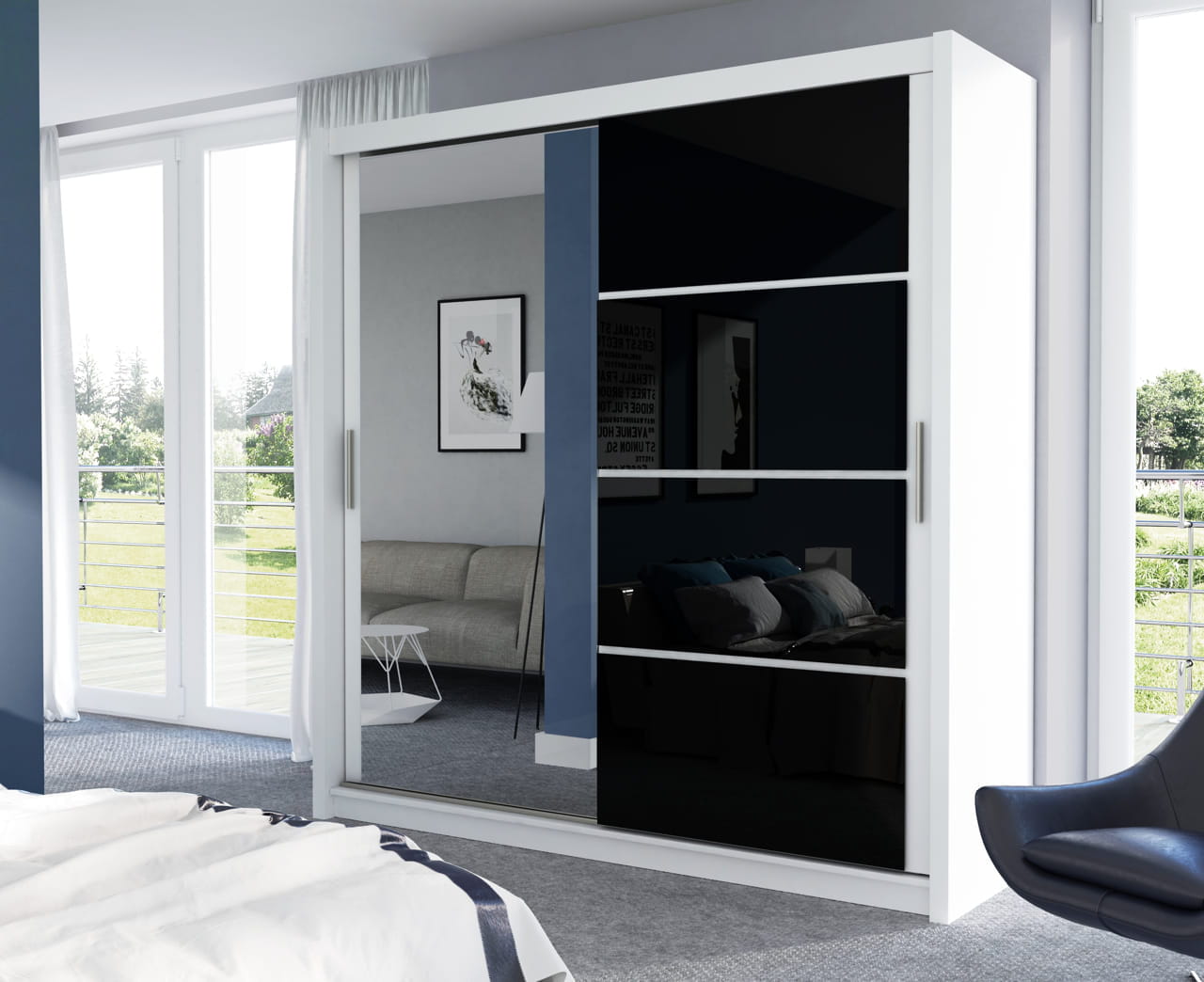 Dwudrzwiowe szafy Brandon, dzięki uniwersalnemu wzornictwu, sprawdzą się zarówno w sypialni, jak i pokoju gościnnym. Mniejszy model, o szerokości 150 cm, świetnie nadaje się również do przedpokoju. Na jednym froncie znajduje się lustro, drugie tworzą cztery tafl e czarnego szkła, co optycznie pomniejsza gabaryty mebla.
