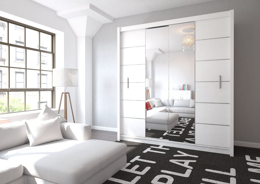Lizbona 2 (250) ma trzy przesuwne fronty. Lustro zajmuje środkowy oraz fragmenty obu frontów sąsiednich. Razem tworzą ciekawy efekt wizualny, co predestynuje szafę do ustawienia w eksponowanym miejscu.