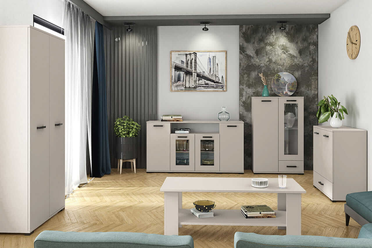 - Praktyczne rozwiązania – pojemne szafki, witryny z przeszkleniami oraz funkcjonalne stoliki kawowe sprawdzą się w codziennym użytkowaniu.