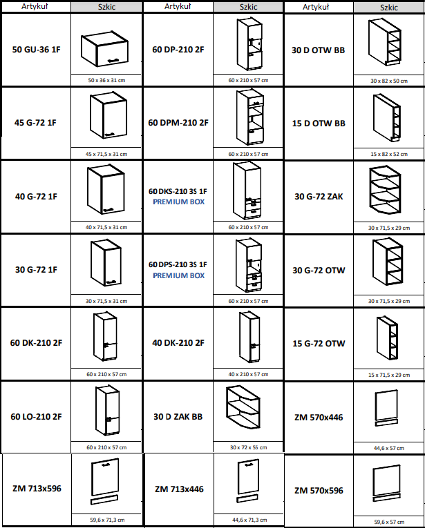 Wszystkie dostępne szafki kuchni Karmen wraz z wymiarami: