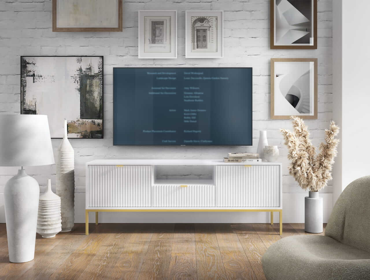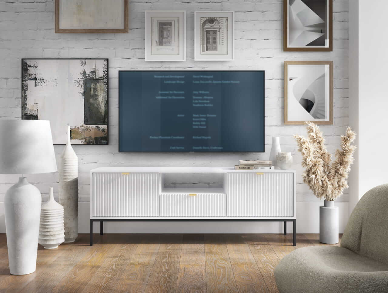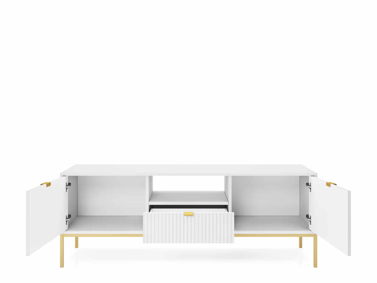 Kolekcja mebli Nova to nowoczesne połączenie funkcjonalności i minimalistycznego designu, idealne do stylowych wnętrz. Charakteryzuje się jasną kolorystyką z dominującą bielą, subtelnymi złotymi uchwytami oraz eleganckimi pionowymi żłobieniami na frontach. Smukłe, metalowe nóżki nadają meblom lekkości, a ich wysoka jakość wykonania zapewnia trwałość i wygodę użytkowania. Kolekcja obejmuje różnorodne elementy, takie jak komody, stoliki kawowe oraz szafki RTV, co pozwala na spójne urządzenie przestrzeni. Idealna dla osób ceniących prostotę, nowoczesność i harmonijne wnętrza.