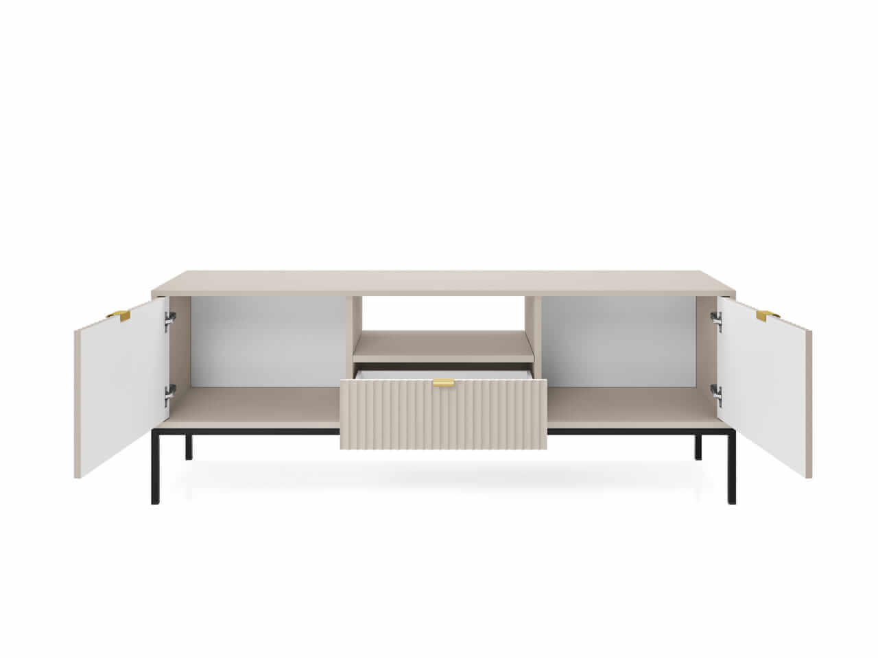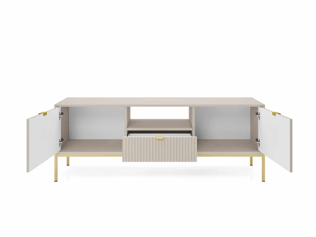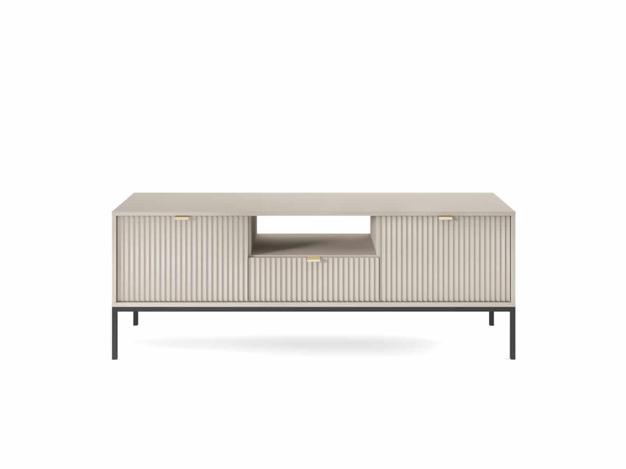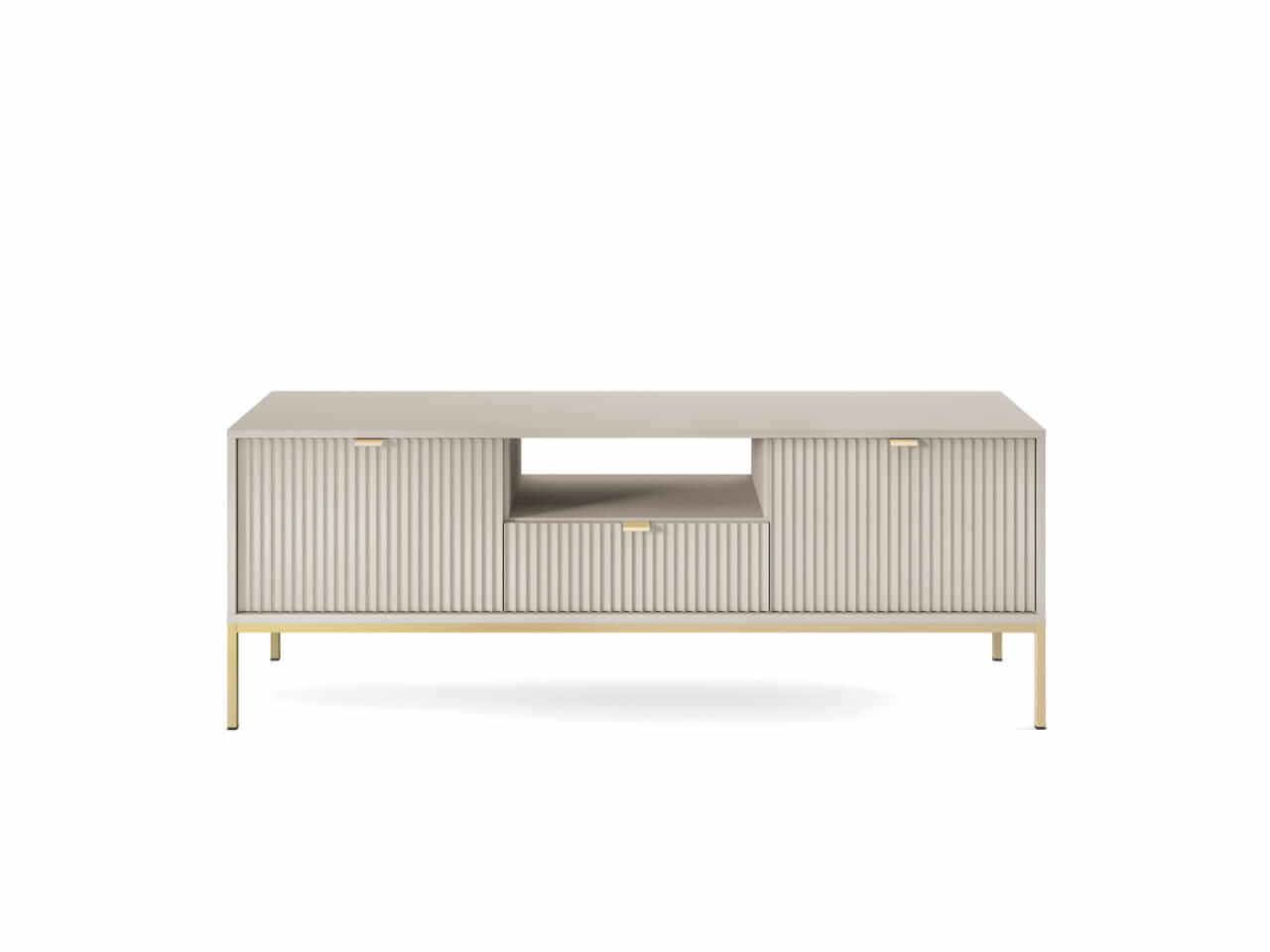 Kolekcja mebli Nova to nowoczesne połączenie funkcjonalności i minimalistycznego designu, idealne do stylowych wnętrz. Charakteryzuje się jasną kolorystyką z dominującym kaszmirem, subtelnymi złotymi uchwytami oraz eleganckimi pionowymi żłobieniami na frontach. Smukłe, metalowe nóżki nadają meblom lekkości, a ich wysoka jakość wykonania zapewnia trwałość i wygodę użytkowania. Kolekcja obejmuje różnorodne elementy, takie jak komody, stoliki kawowe oraz szafki RTV, co pozwala na spójne urządzenie przestrzeni. Idealna dla osób ceniących prostotę, nowoczesność i harmonijne wnętrza.