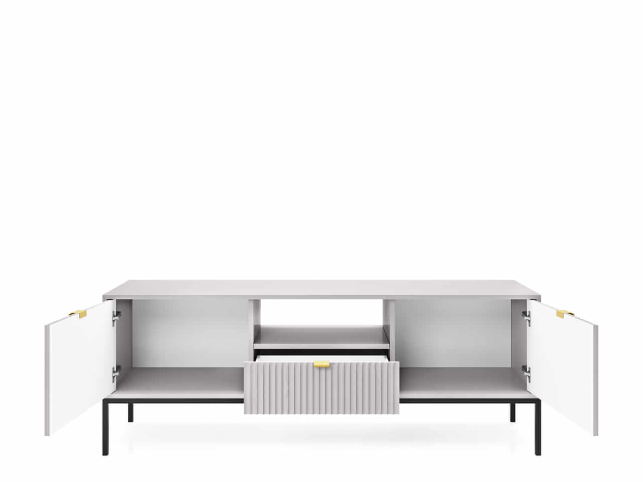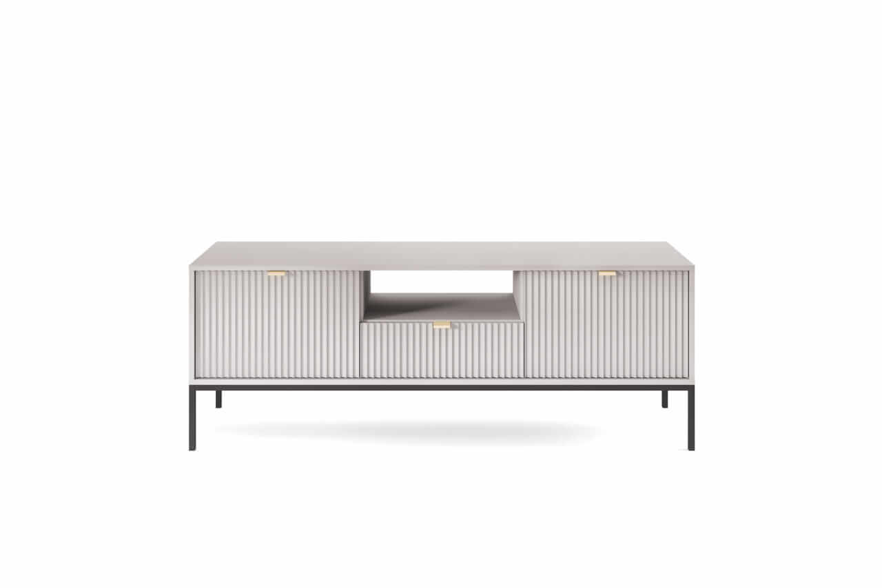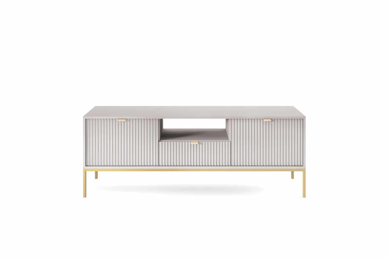 Kolekcja mebli Nova to nowoczesne połączenie funkcjonalności i minimalistycznego designu, idealne do stylowych wnętrz. Charakteryzuje się jasną szarą kolorystyką, subtelnymi złotymi uchwytami oraz eleganckimi pionowymi żłobieniami na frontach. Smukłe, metalowe nóżki nadają meblom lekkości, a ich wysoka jakość wykonania zapewnia trwałość i wygodę użytkowania. Kolekcja obejmuje różnorodne elementy, takie jak komody, stoliki kawowe oraz szafki RTV, co pozwala na spójne urządzenie przestrzeni. Idealna dla osób ceniących prostotę, nowoczesność i harmonijne wnętrza.