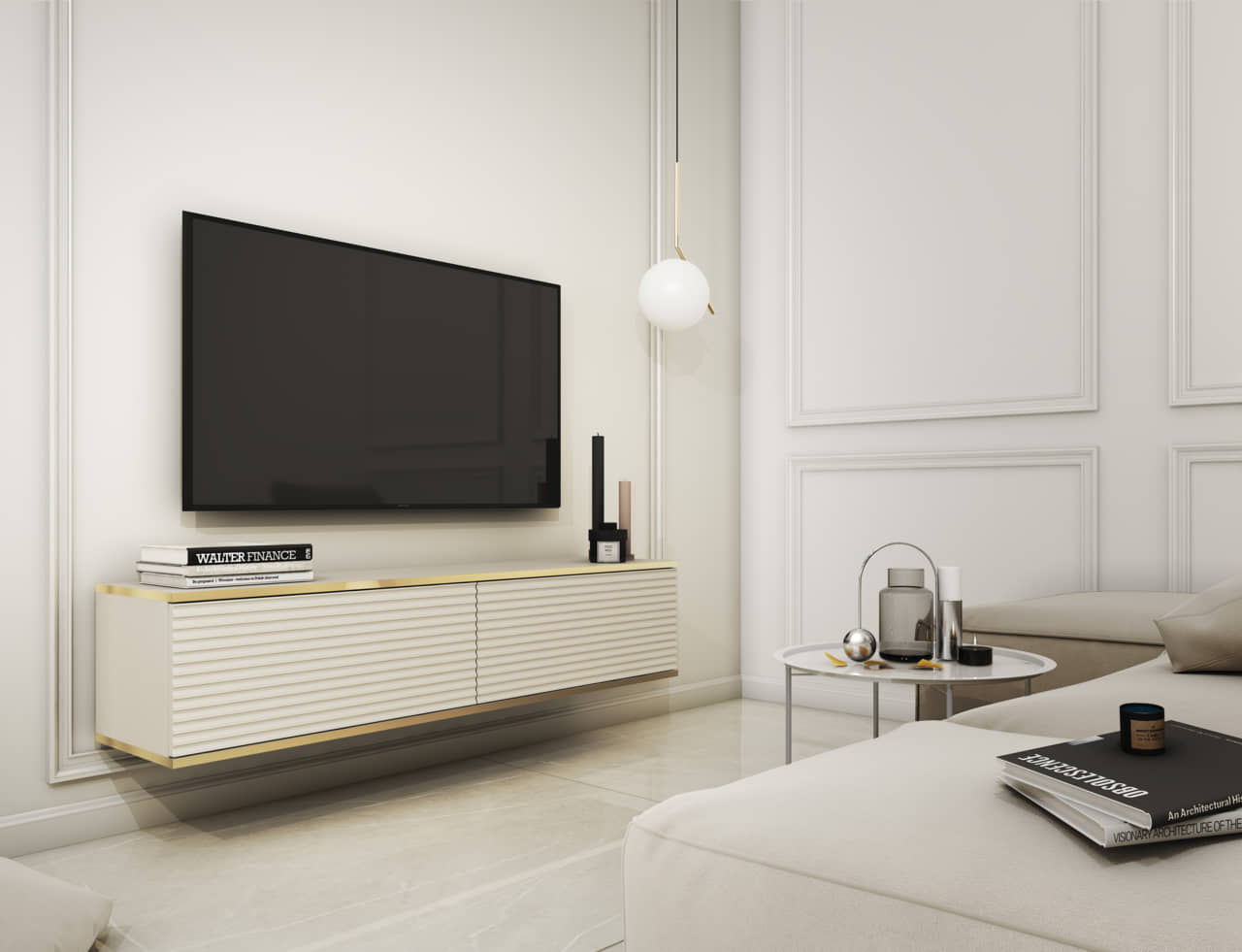 Elegancka i stylowa szafka RTV z kolekcji Oro w kolorze beżowym. Szczególną uwagę zwraca górna i dolna krawędź mebla, która została wykończona złotymi listwami.