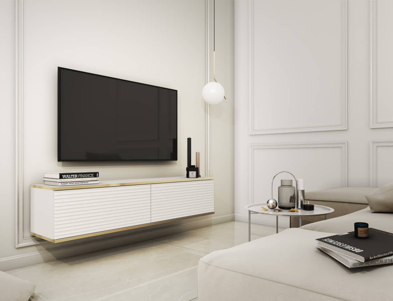 Elegancka i stylowa szafka RTV z kolekcji Oro w kolorze białym. Szczególną uwagę zwraca górna i dolna krawędź mebla, która została wykończona złotymi listwami.