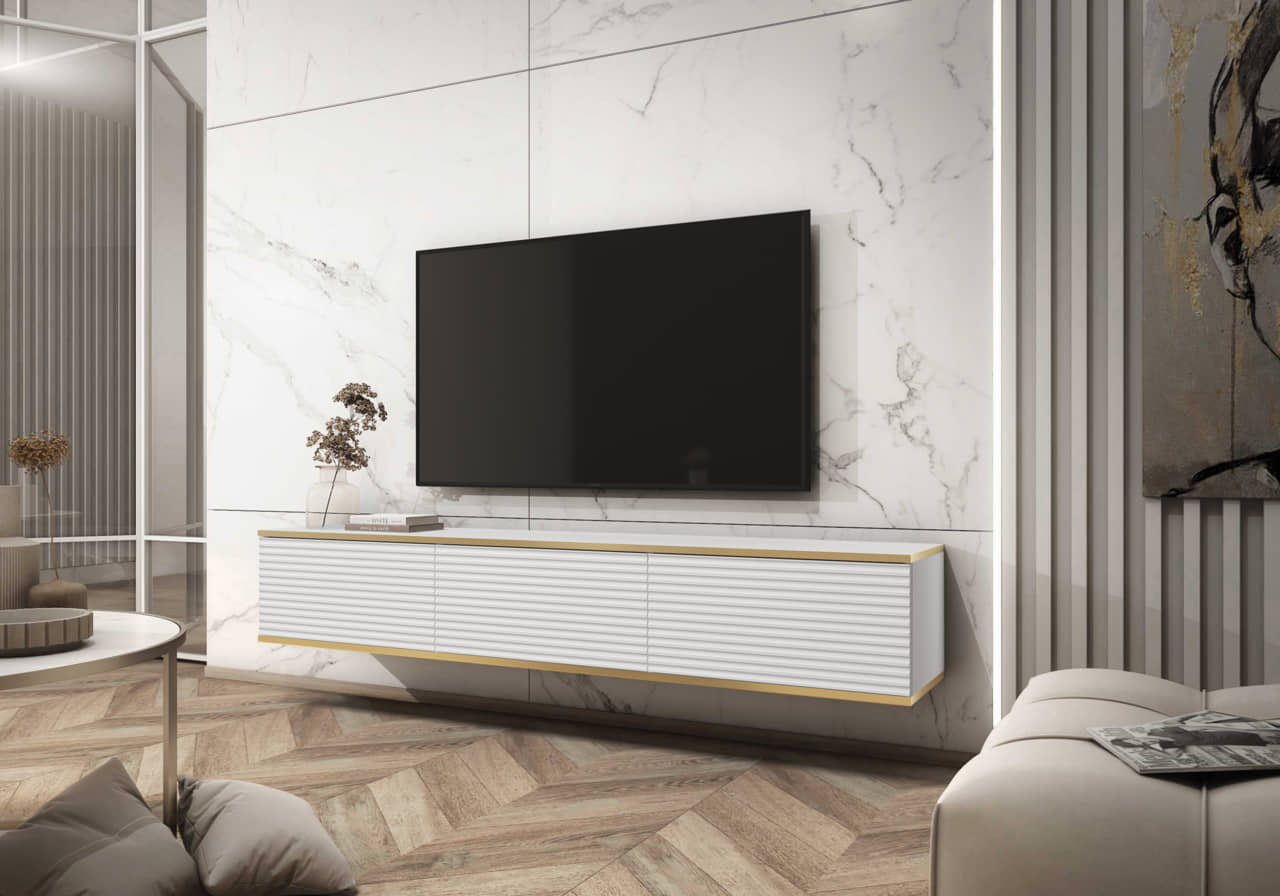 Elegancka i stylowa szafka RTV z kolekcji Oro w kolorze białym. Szczególną uwagę zwraca górna i dolna krawędź mebla, która została wykończona złotymi listwami.