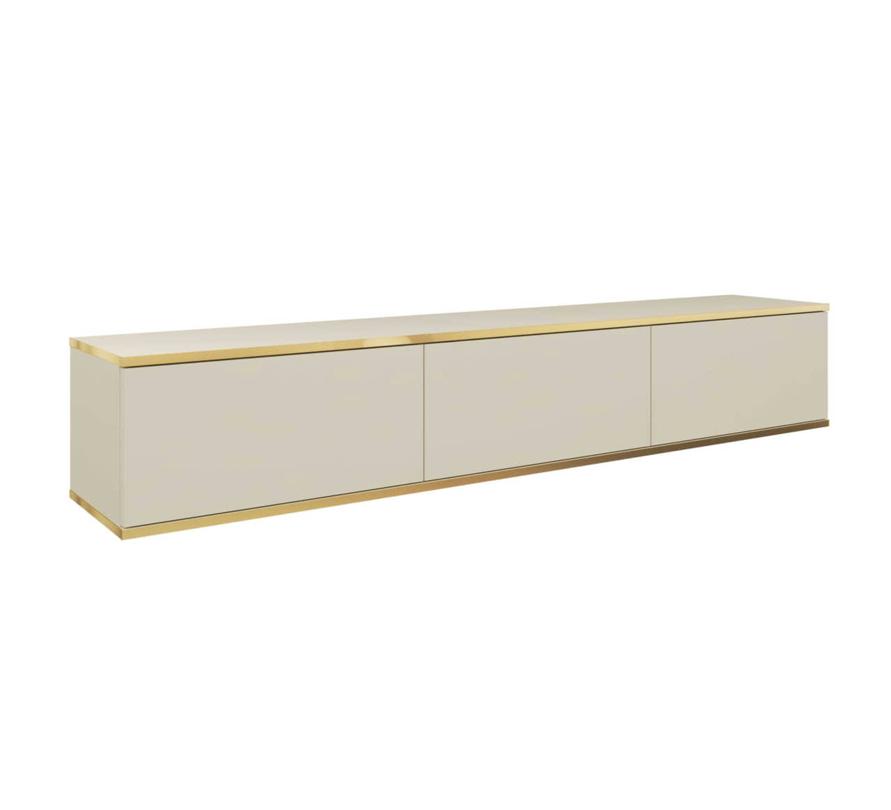 Elegancka i stylowa szafka RTV z kolekcji Oro w kolorze beżowym. Szczególną uwagę zwraca górna i dolna krawędź mebla, która została wykończona złotymi listwami.