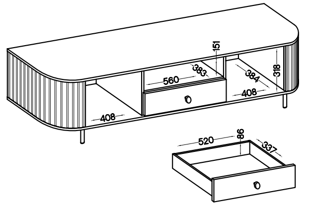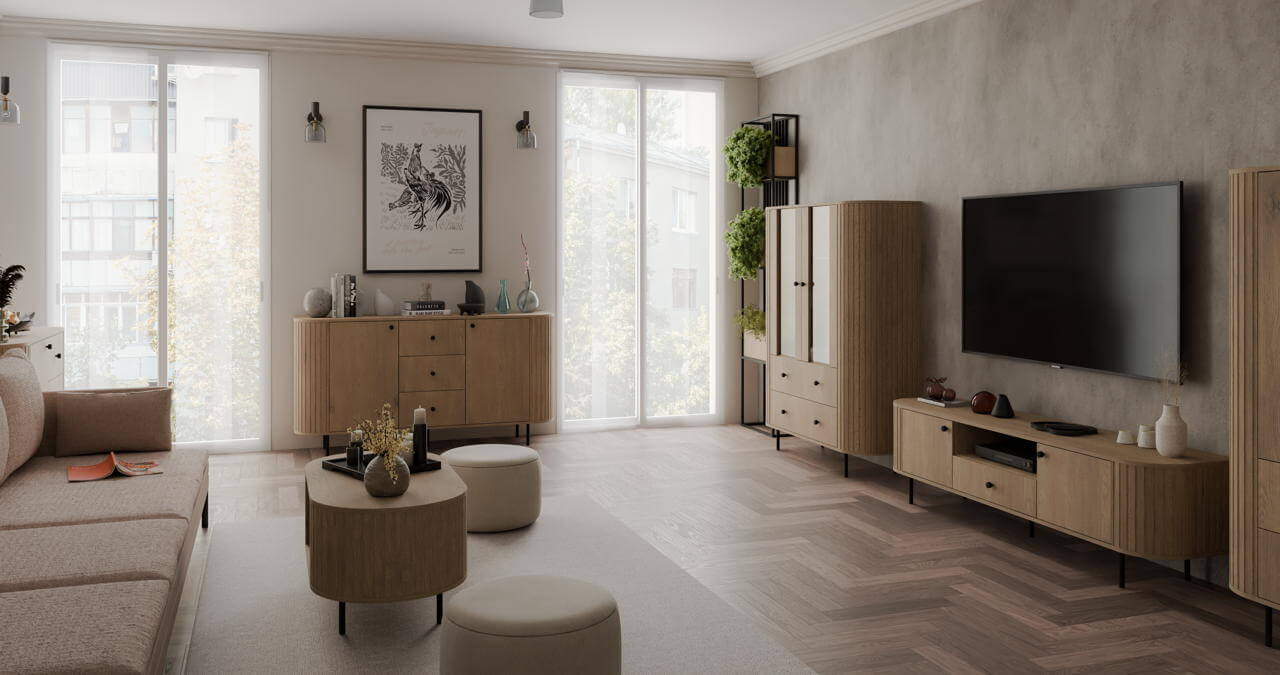 W skład kolekcji Ovalio wchodzą: komody, stoliki RTV, stolik kawowy, lustra, witryny oraz toaletka, co pozwala na kompleksowe i spójne urządzenie salonu, jadalni lub sypialni.