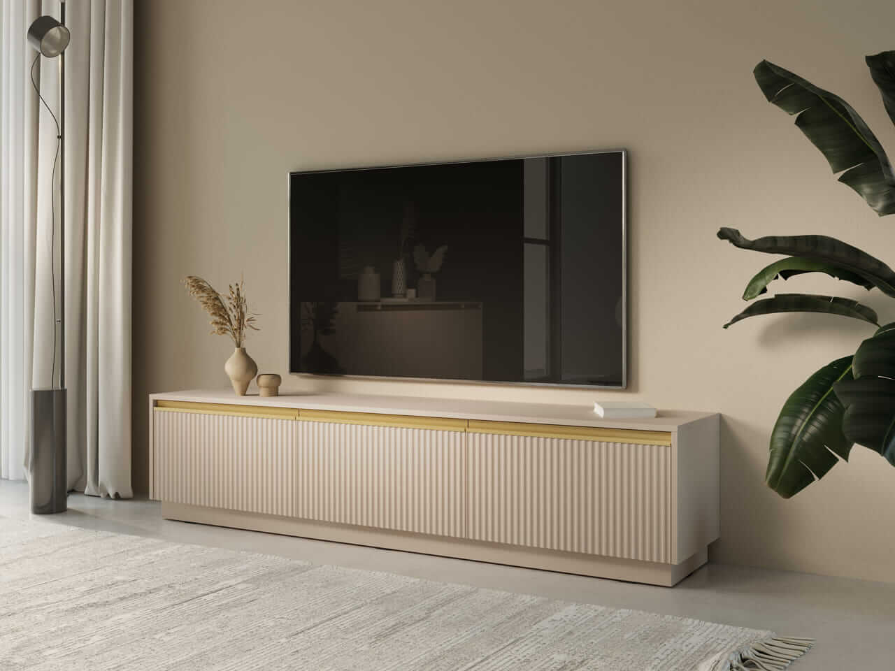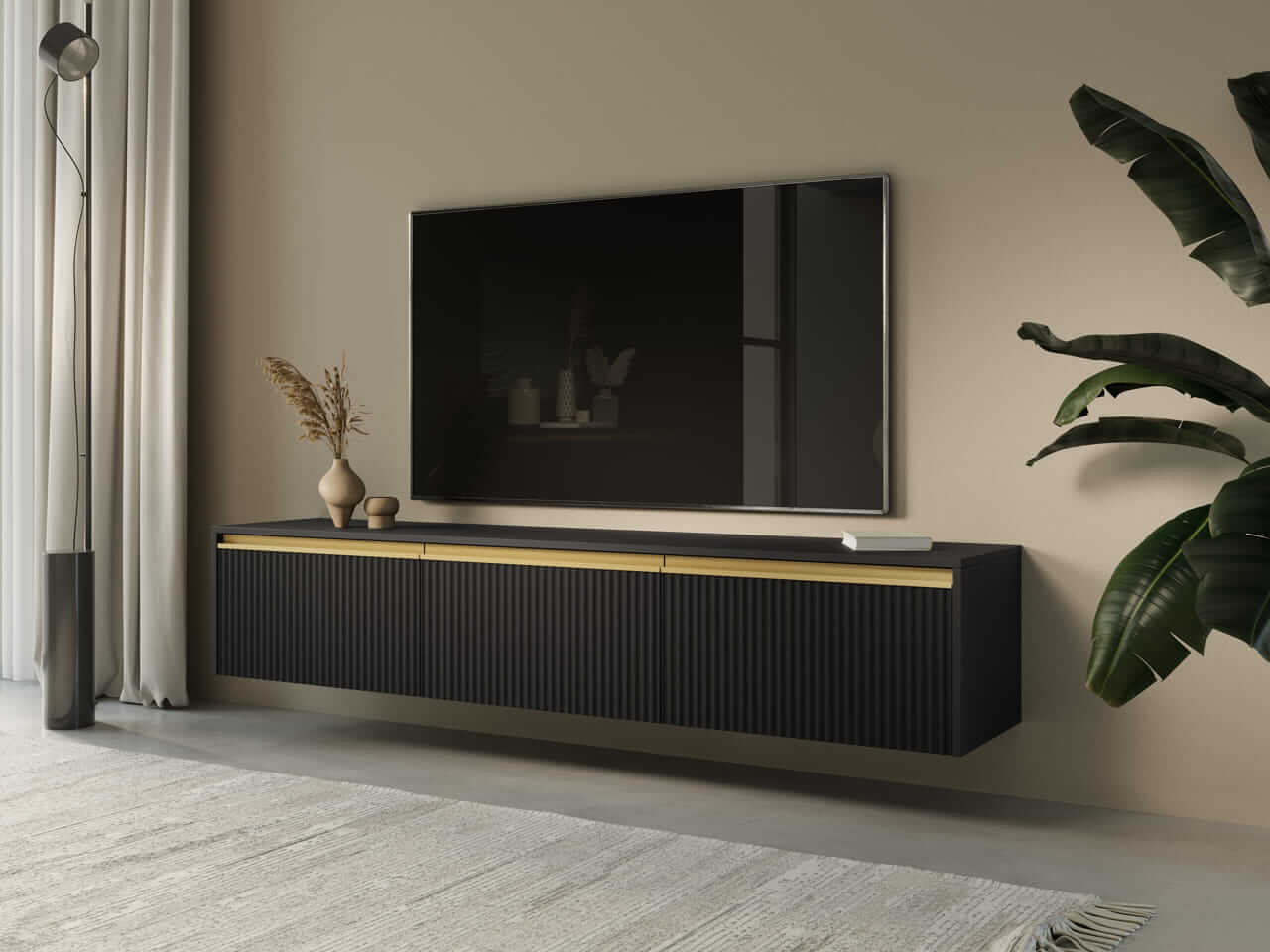 Kolekcja mebli Royal to wyjątkowe połączenie nowoczesnego designu i funkcjonalności, które doskonale wpisuje się w potrzeby współczesnych wnętrz. Ciemna kolorystyka mebli z czarnym wykończeniem oraz subtelne, pionowe żłobienia dodają elegancji i lekkości całej aranżacji. Złote akcenty podkreślają prestiżowy charakter kolekcji, a minimalistyczny wygląd sprawia, że meble świetnie komponują się zarówno w nowoczesnych, jak i klasycznych przestrzeniach.