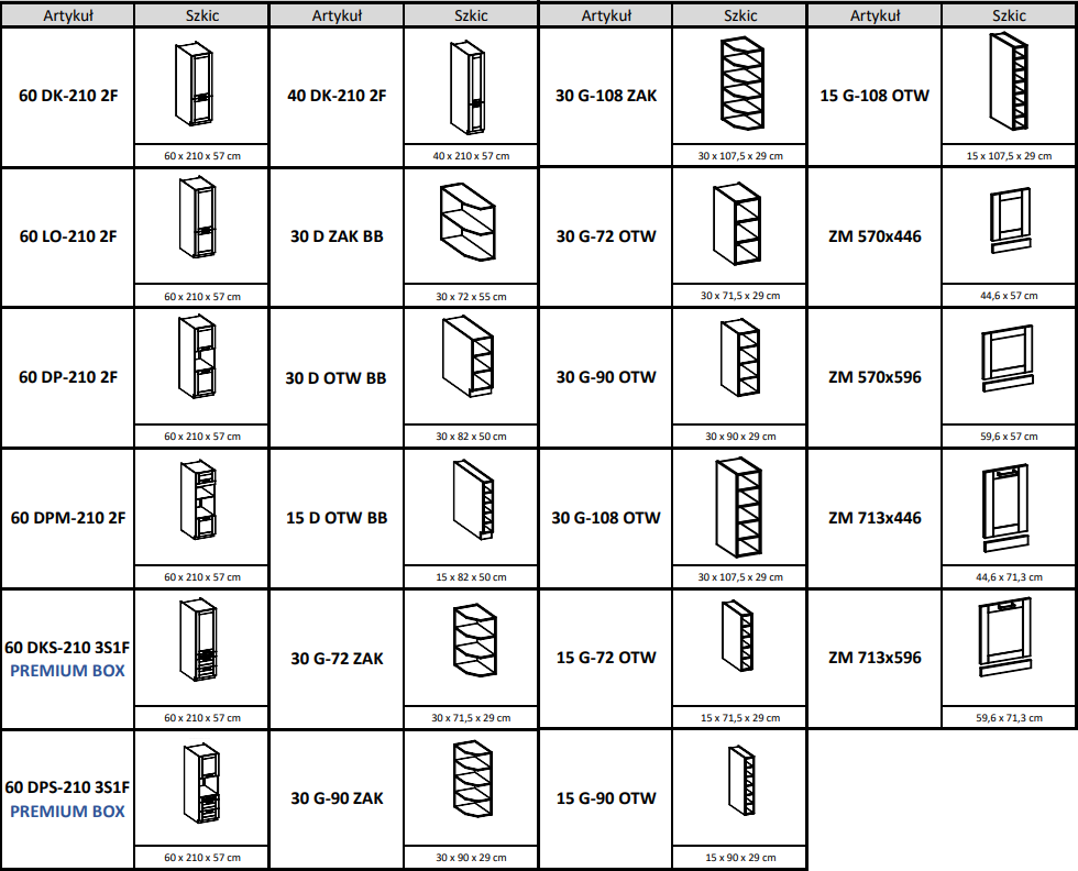 Wszystkie dostępne szafki kuchni Luna: