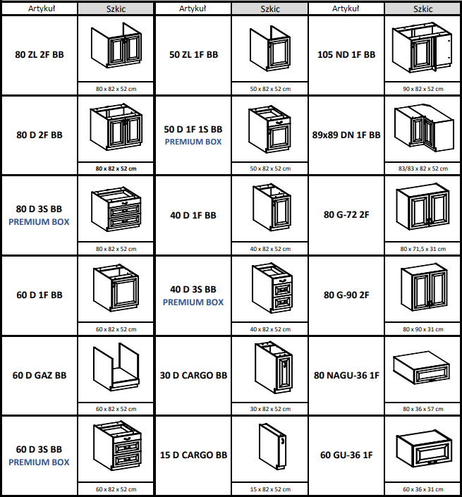Pozostałe szafki kuchni Stilo wraz z wymiarami: