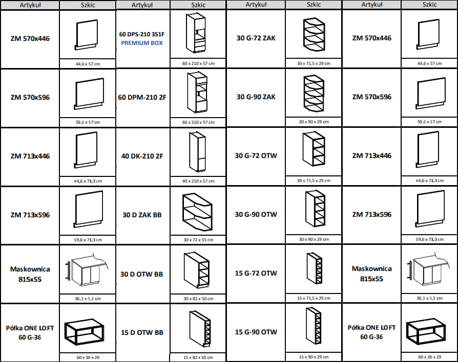 Wszystkie dostępne szafki kuchni Arona/Monza/Siena: