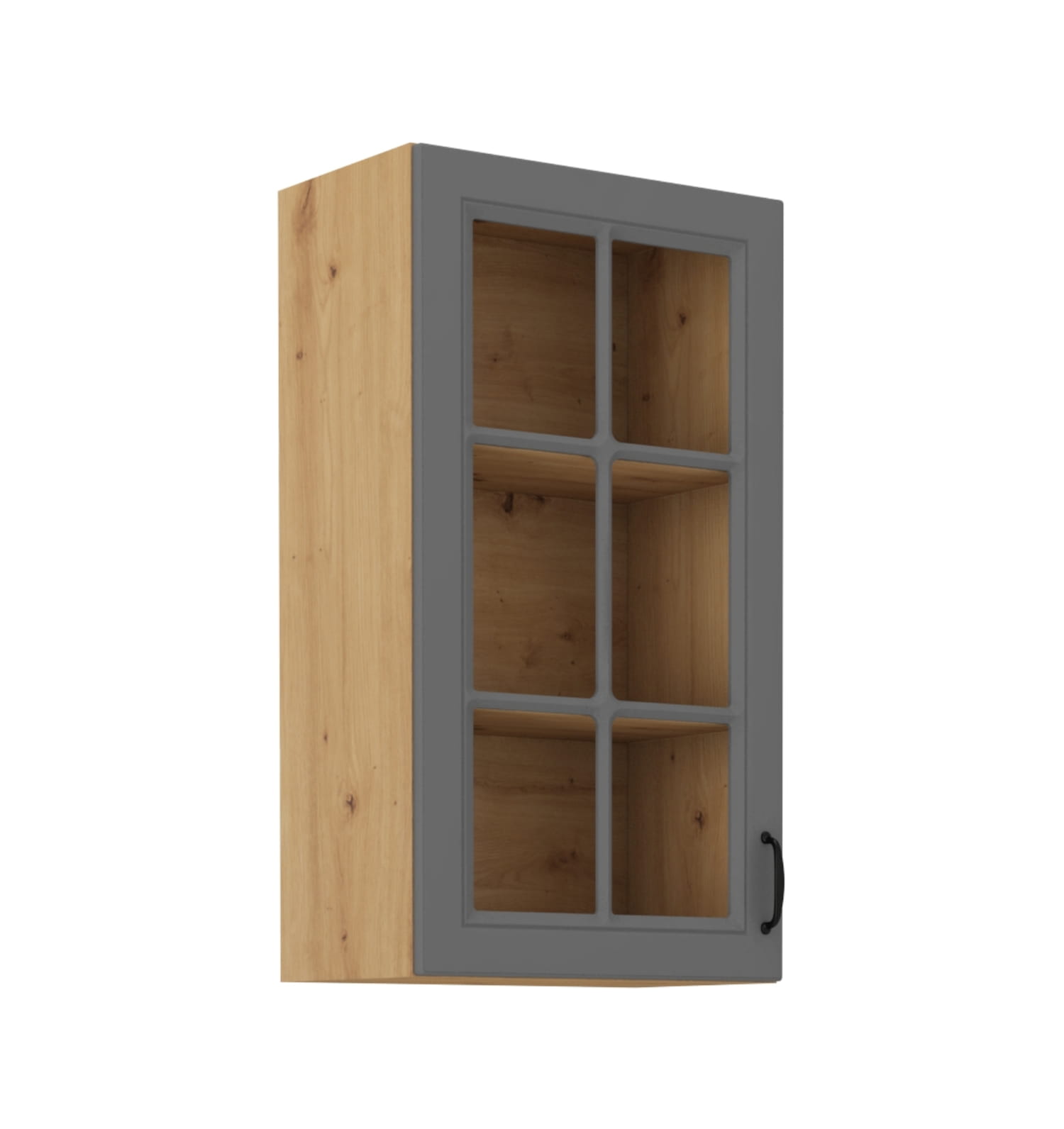 Stilo Dust grey / dąb artisan 40 GS-90 1F - szafka górna 40cm z witryną. Wyposażona została w dwie półki.