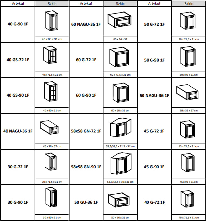 Wszystkie dostępne szafki kuchni Stilo: