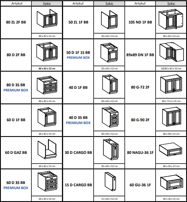 Wszystkie dostępne szafki kuchni Stilo:
